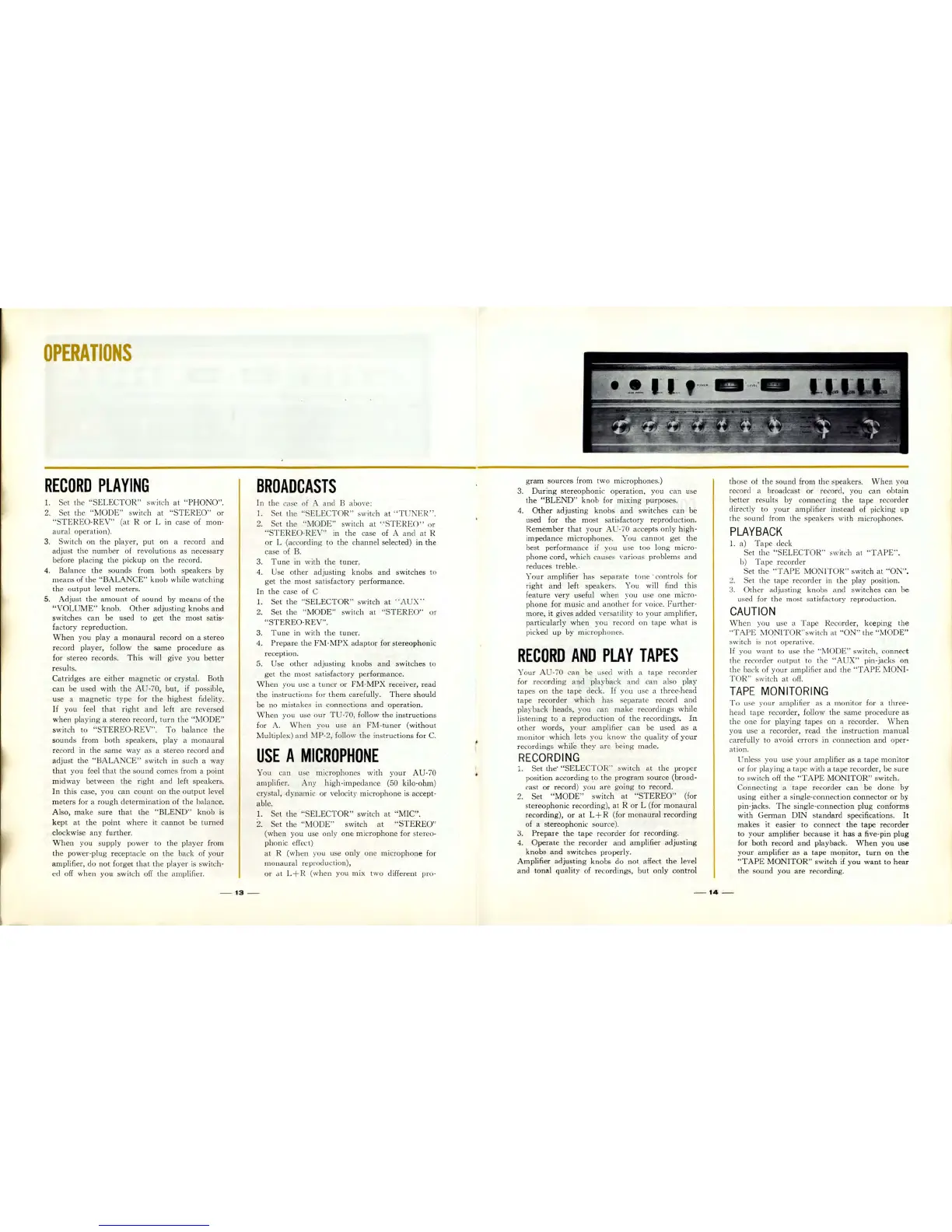 Sansui AU-70 - Operations Guide; Record Playing Procedures; Broadcast Reception; Tape Recording and Playback