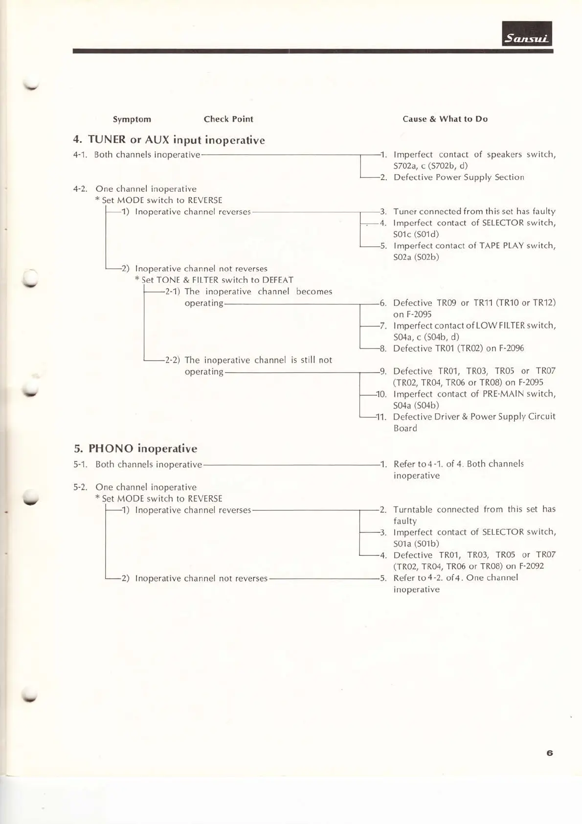 Sansui AU-7700 - TUNER AND AUX INPUT TROUBLESHOOTING; Both Channels Inoperative (Tuner;AUX); One Channel Inoperative (Tuner;AUX); PHONO INPUT TROUBLESHOOTING