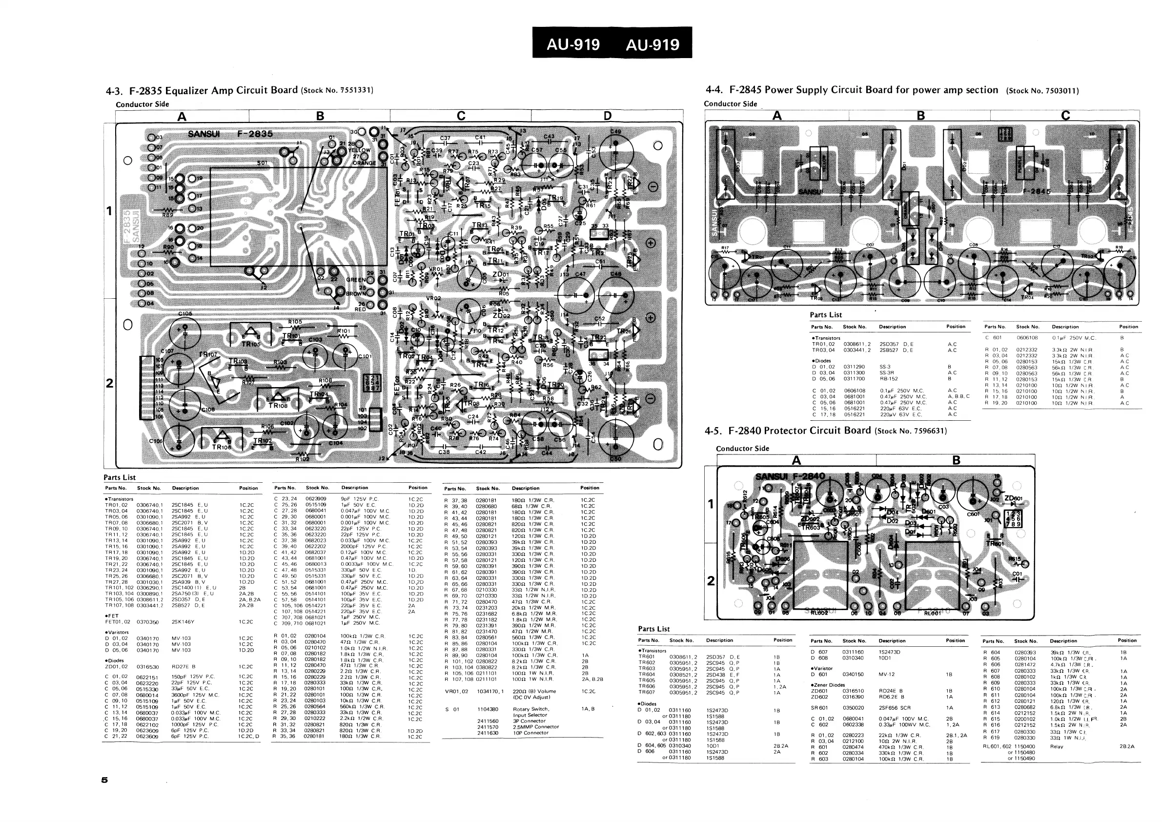 Sansui AU-919 - F-2835 Equalizer Amp Circuit Board; F-2845 Power Supply Circuit Board for Power Amp Section; F-2840 Protector Circuit Board