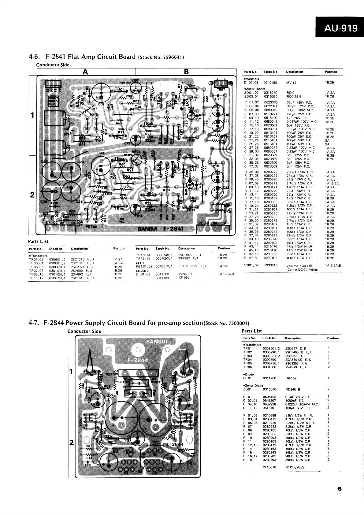 Sansui AU-919 - F-2841 Flat Amp Circuit Board; F-2844 Power Supply Circuit Board for Pre-Amp Section