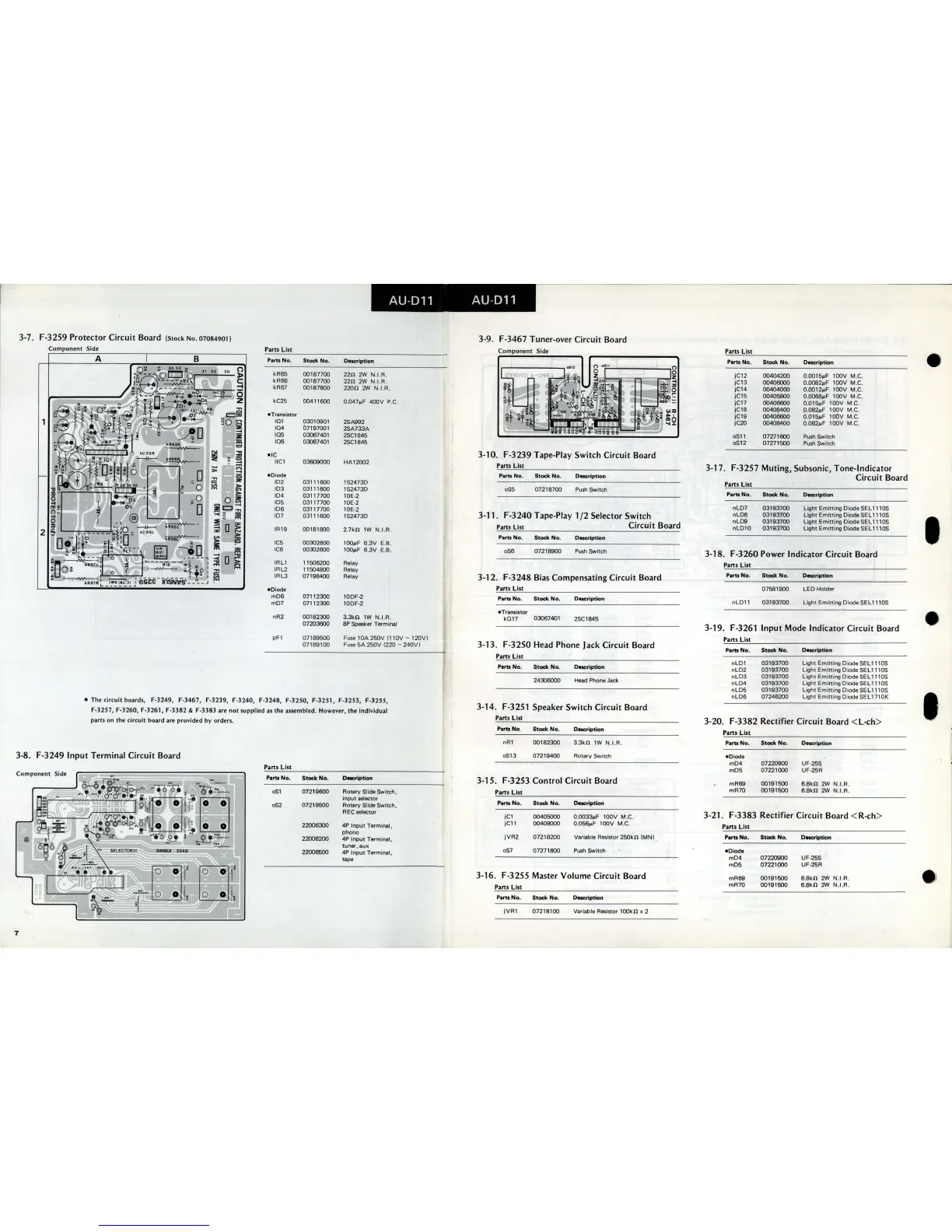 Sansui AU-D11 - F-3259 Protector Circuit Board Parts; F-3249 Input Terminal Circuit Board Parts; F-3467 Tuner-over Circuit Board Parts; F-3239 Tape-Play Switch Circuit Board Parts