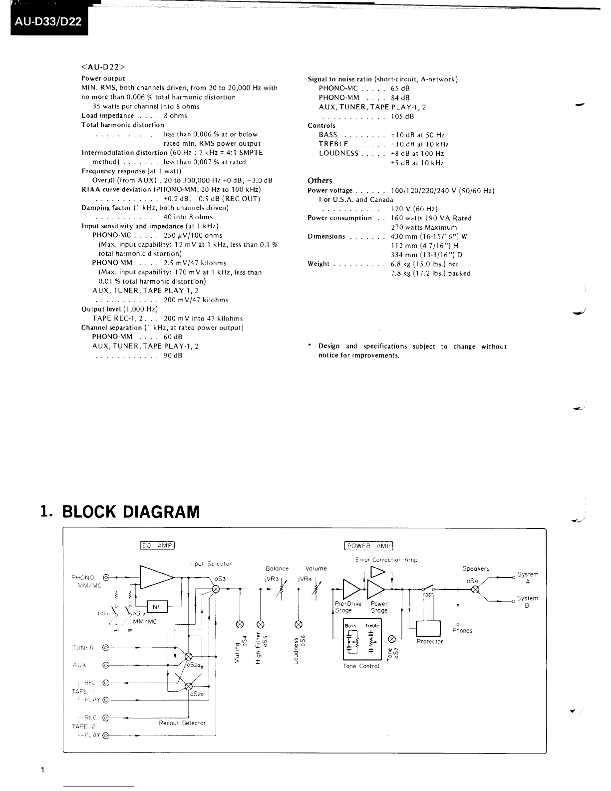 Sansui AU-D33 - AU-D22 Model Specifications; System Block Diagram