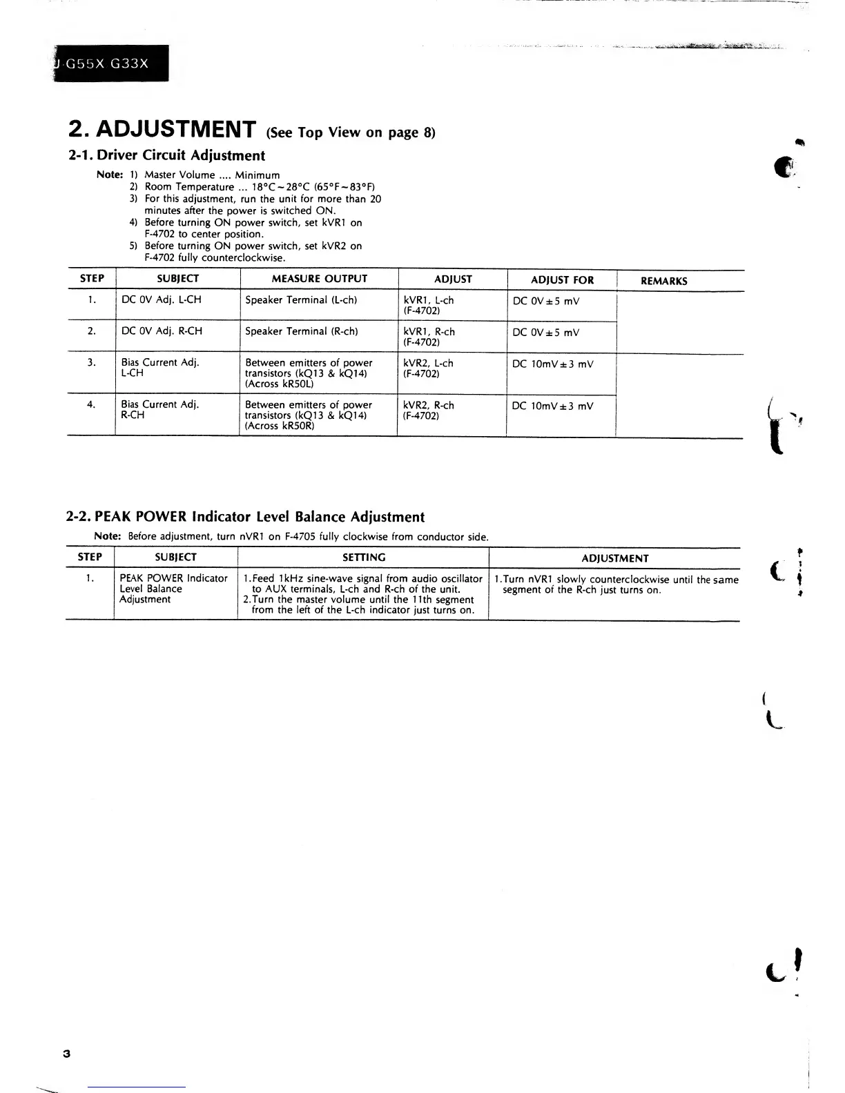 Sansui AU-G33X - Adjustment Procedures; Driver Circuit Adjustment; Peak Power Indicator Adjustment
