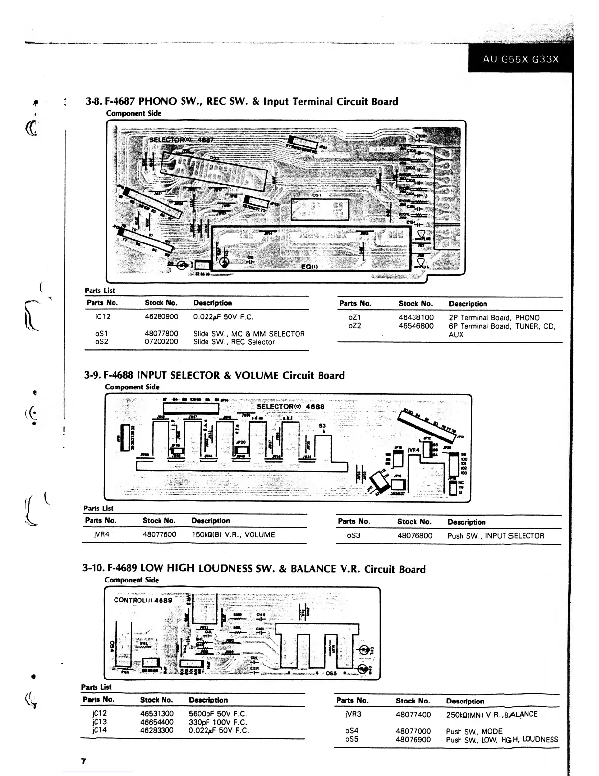 Sansui AU-G55X - Parts Location and Lists; F-4687 Phono;Rec SW. & Input Terminal Board; F-4688 Input Selector & Volume Board; F-4689 Loudness & Balance VR Board
