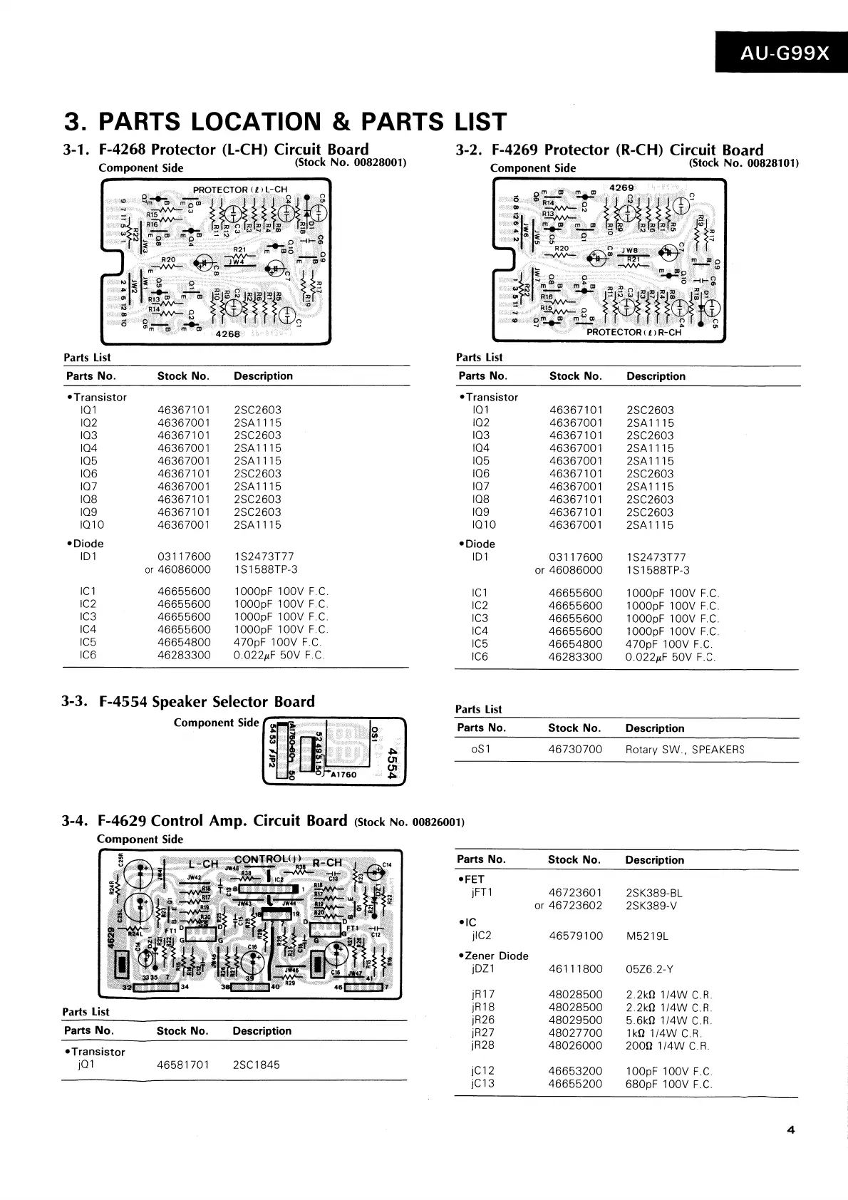 Sansui AU-G99X - Parts Lists and Locations; Protector and Speaker Boards; Control Amplifier Board