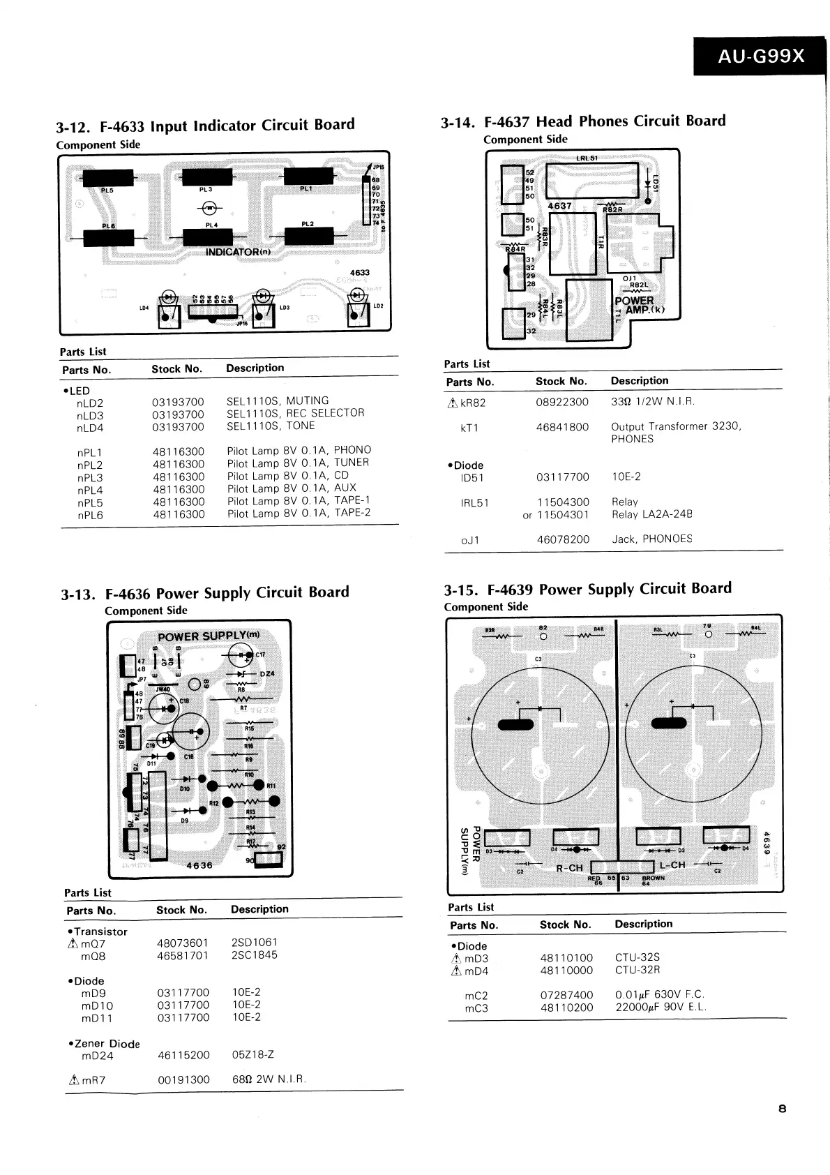 Sansui AU-G99X - Indicator and Supply Circuit Boards; F-4634 Control Amp. Circuit Board; F-4633 Input Indicator Circuit Board; F-4637 Head Phones Circuit Board