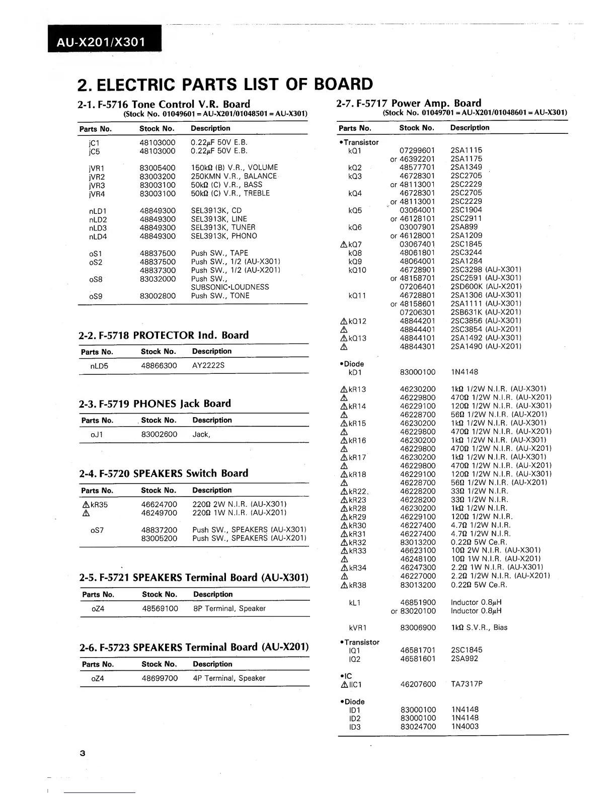Sansui AU-X201 - Electric Parts List; F-5716 Tone Control V.R. Board Parts; F-5718 Protector Indicator Board Parts; F-5719 Phones Jack Board Parts