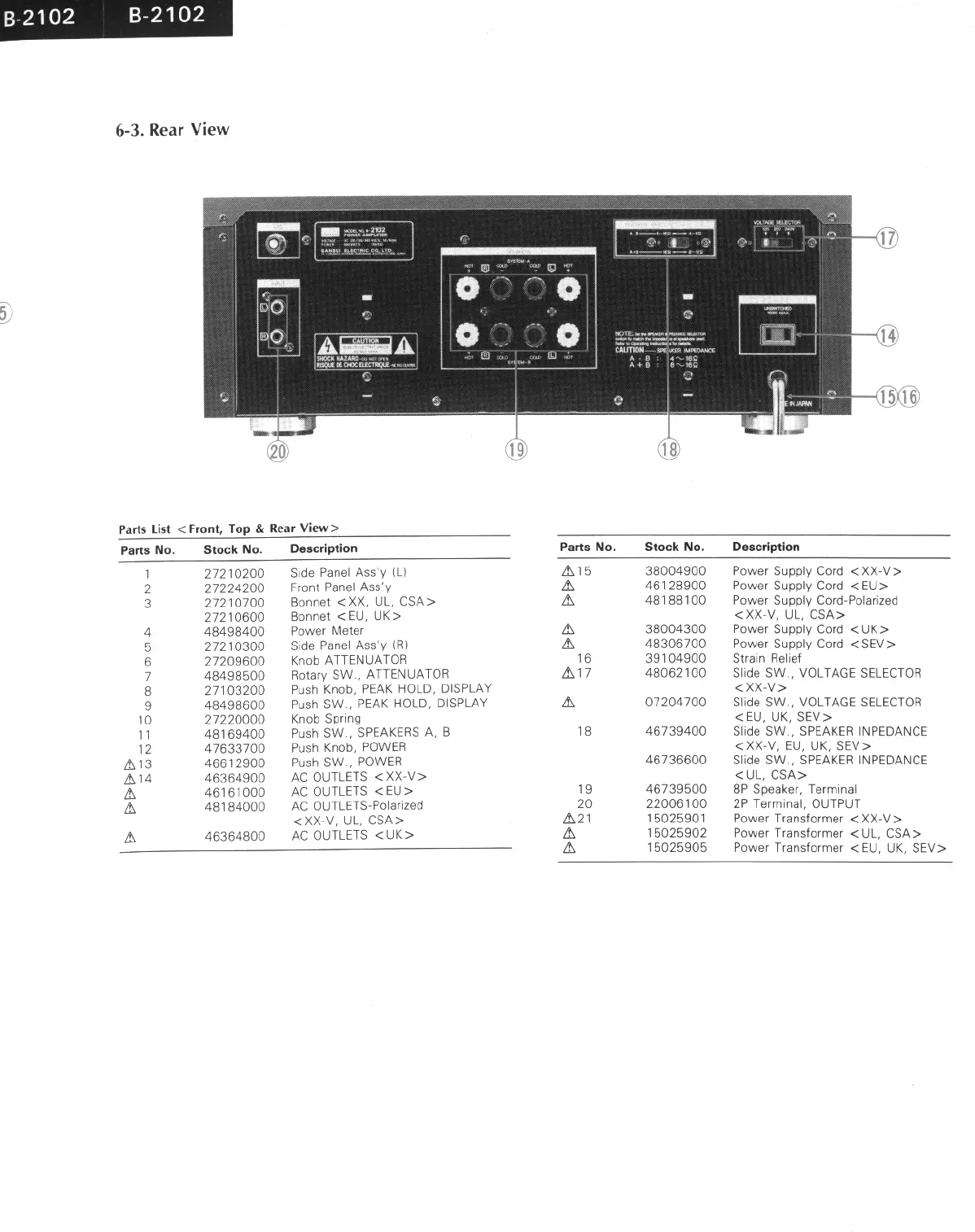 Sansui B-2102 - Rear View Overview; Rear Panel Connections and Controls; Parts List <Front, Top & Rear View>