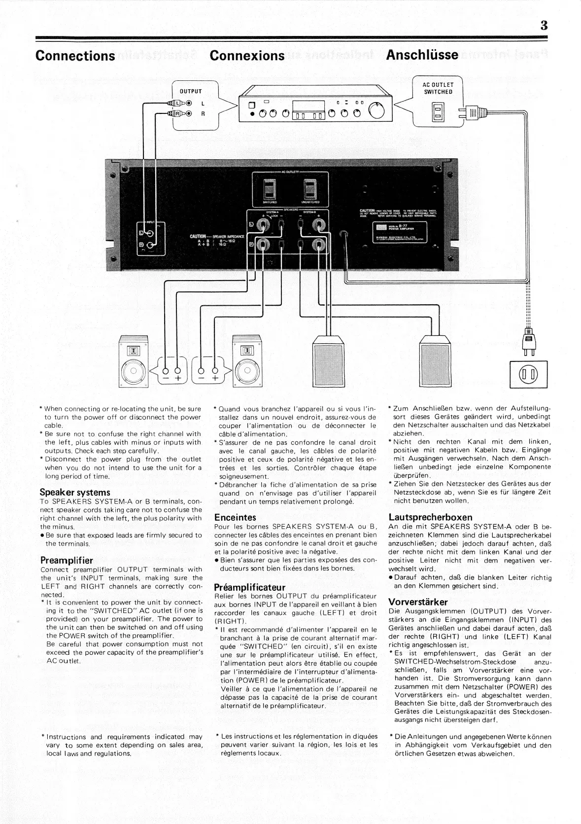 Sansui B-77 - Connections; Speaker System Wiring; Preamplifier Input Connection