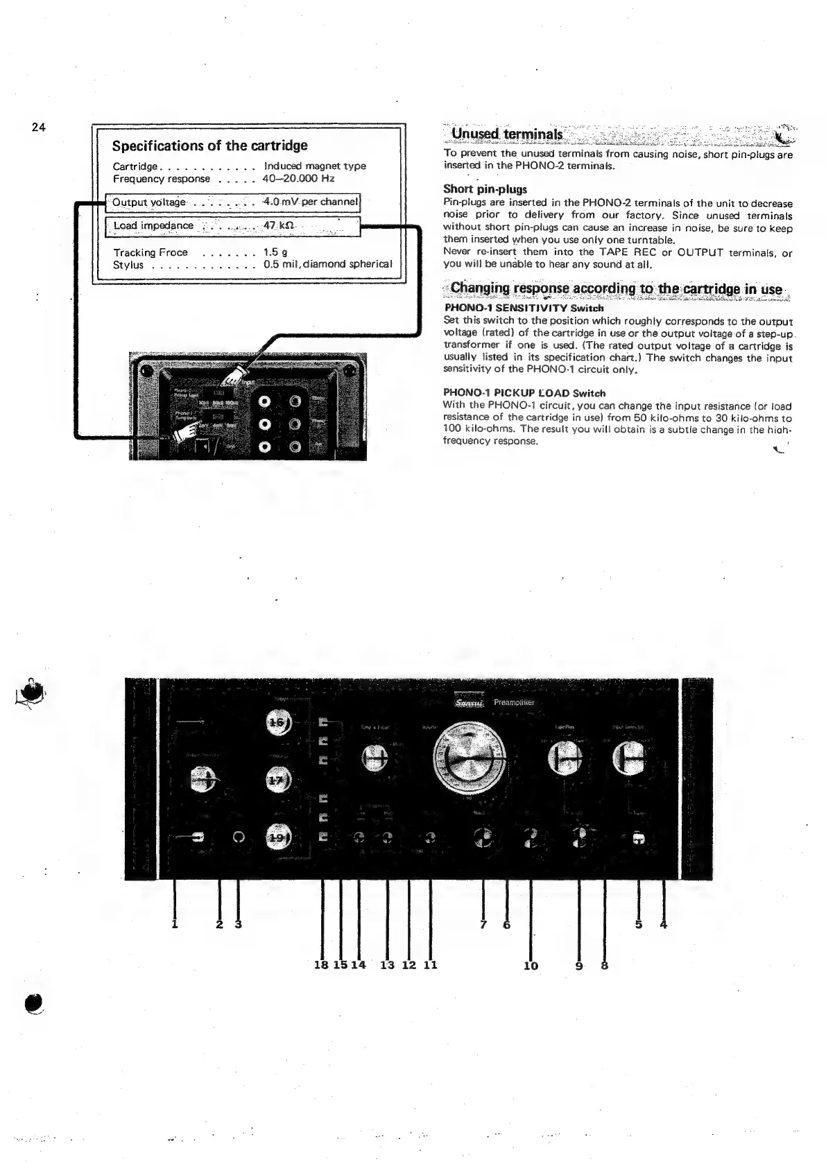 Sansui CA-2000 - Terminal and Cartridge Setup; Unused Terminals and Pin-Plugs; PHONO-1 Sensitivity Adjustment; PHONO-1 Pickup Load Adjustment
