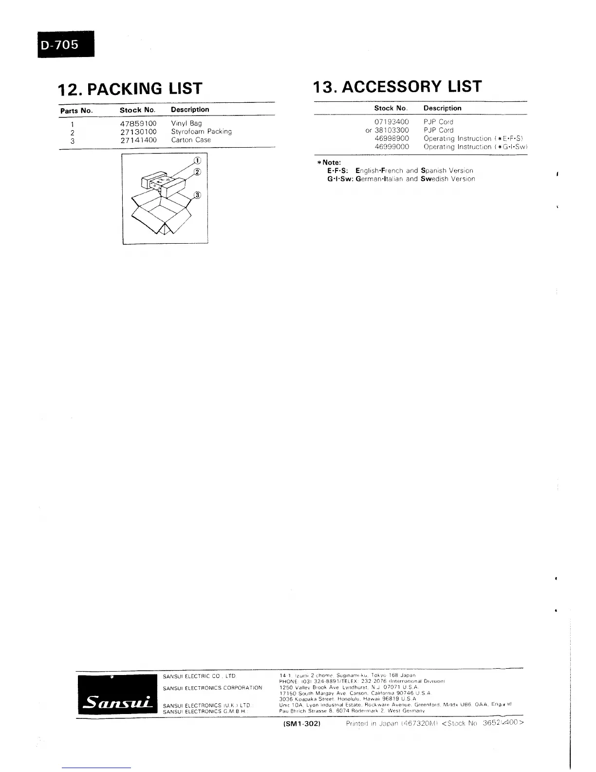 Sansui D-705 - PACKING LIST; ACCESSORY LIST