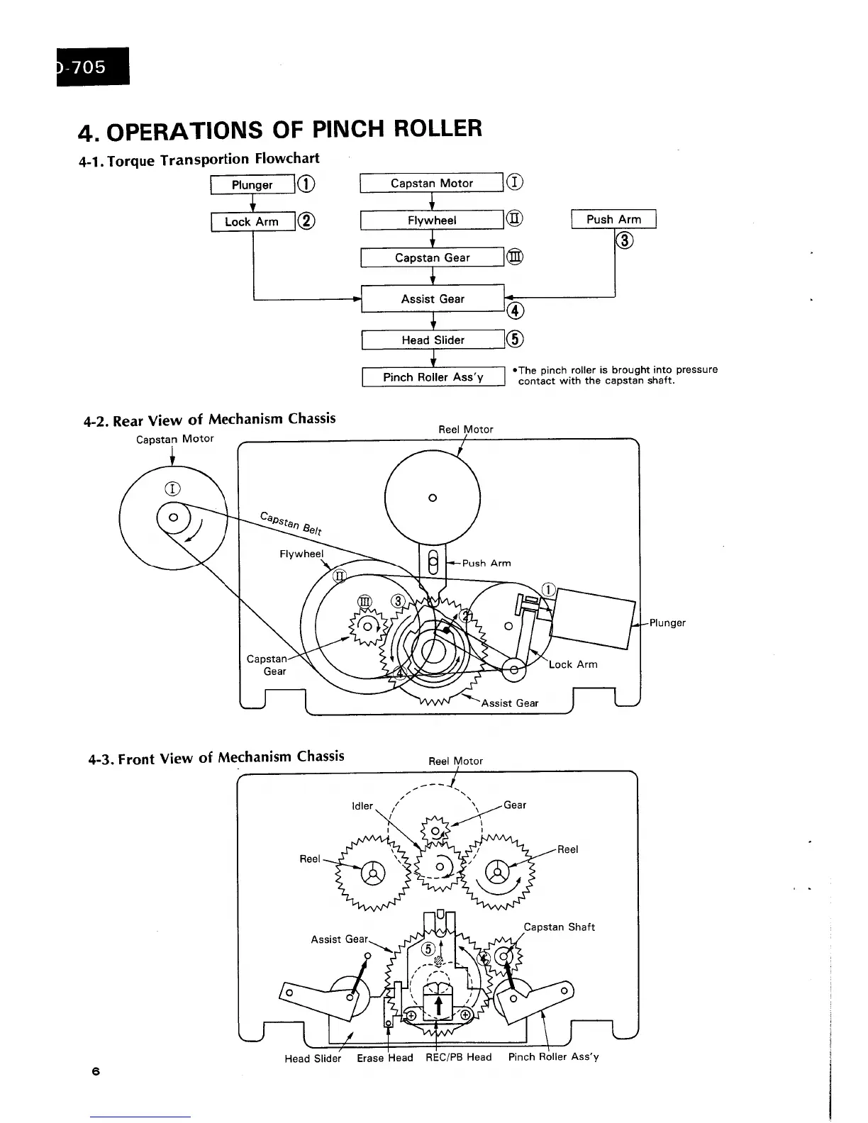 Sansui D-705 - PINCH ROLLER OPERATIONS; TORQUE TRANSPORTION FLOWCHART; REAR VIEW OF MECHANISM CHASSIS; FRONT VIEW OF MECHANISM CHASSIS