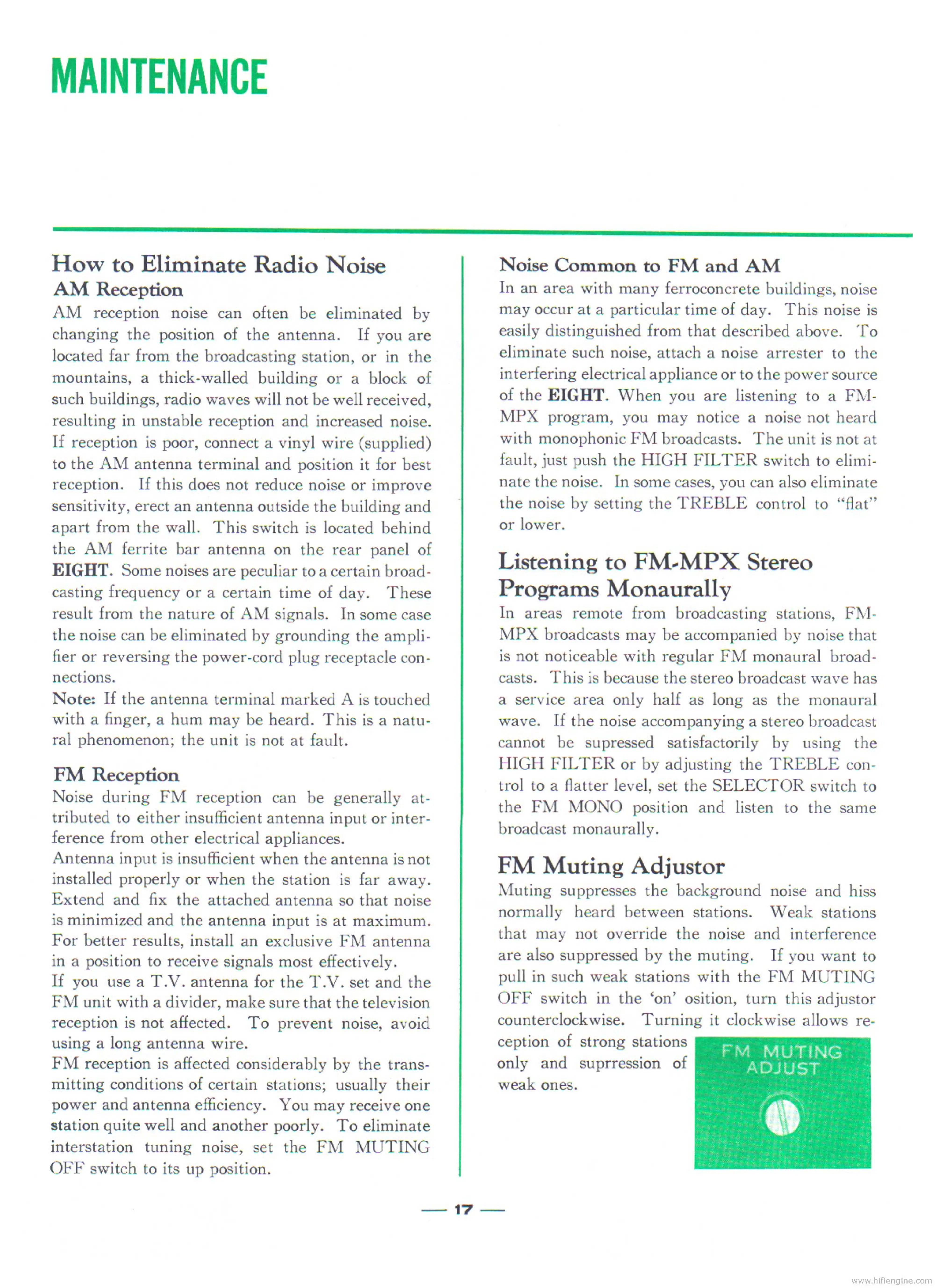 Sansui EIGHT - Maintenance and Troubleshooting; Eliminating Radio Noise; FM Muting Adjustor