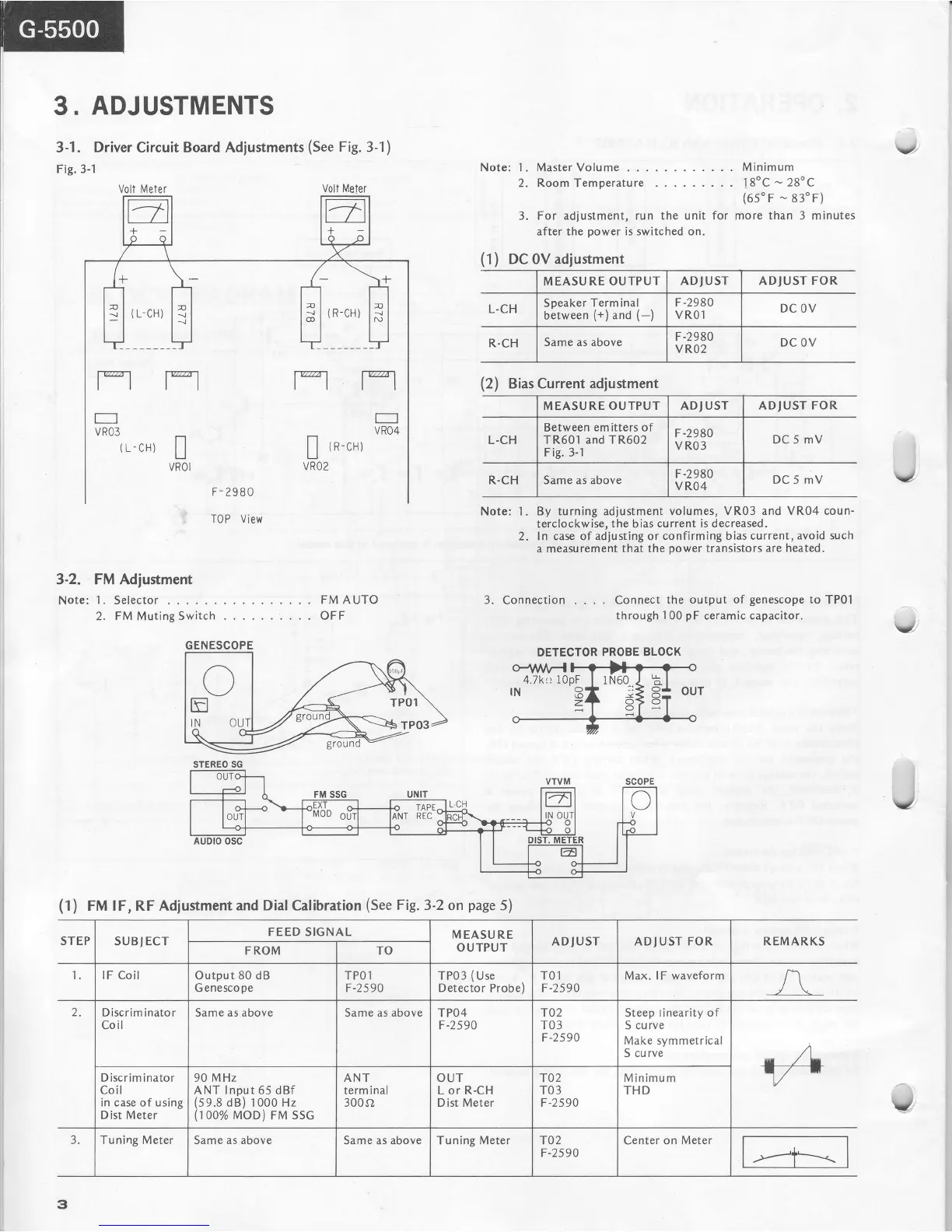 Sansui G-5500 - Adjustments; Driver Circuit Adjustments; FM IF, RF, and Dial Calibration; FM Stereo Adjustments