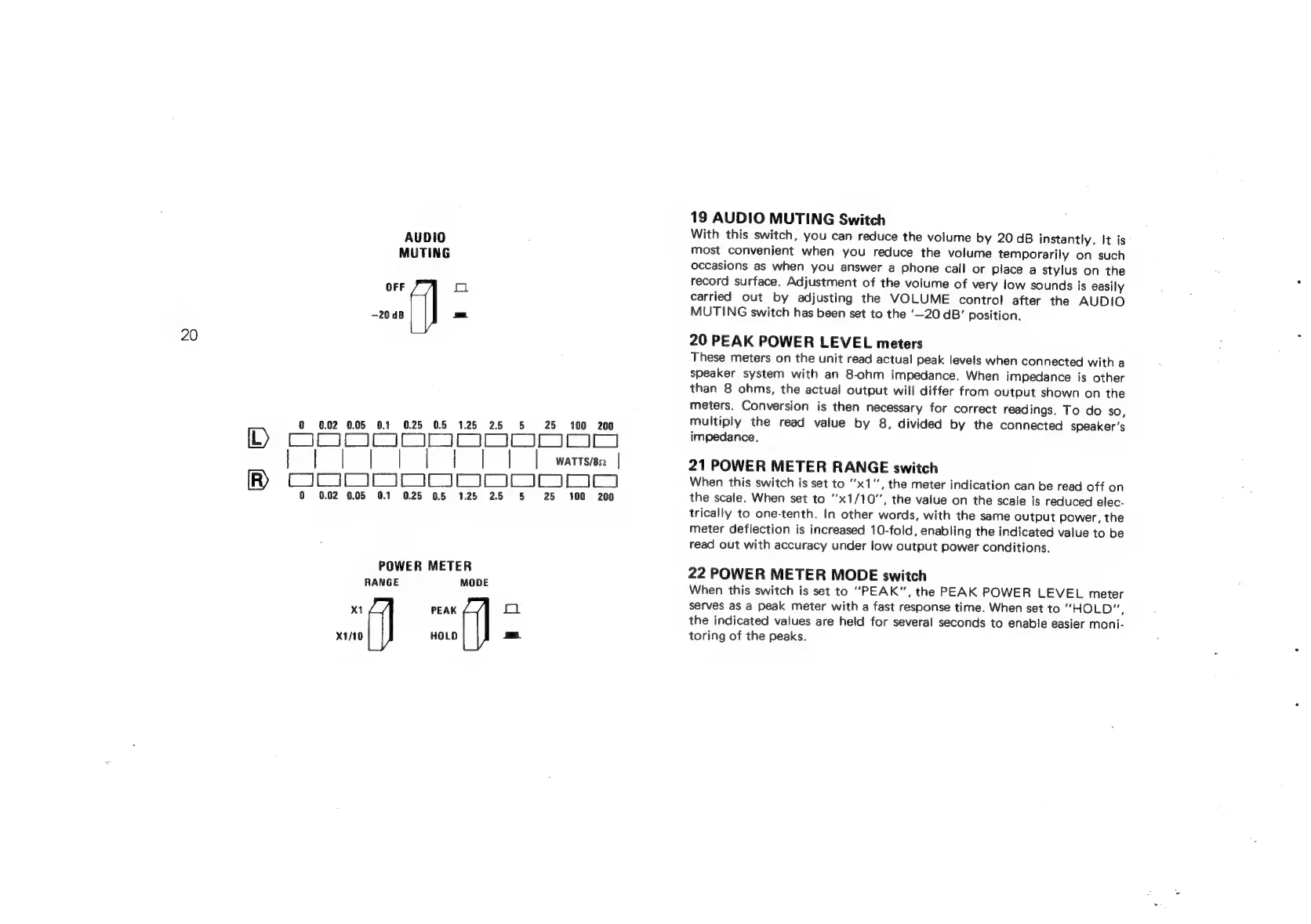Sansui G-9700 - Power Meter and Muting Features; AUDIO MUTING Switch; PEAK POWER LEVEL Meters; POWER METER RANGE Switch