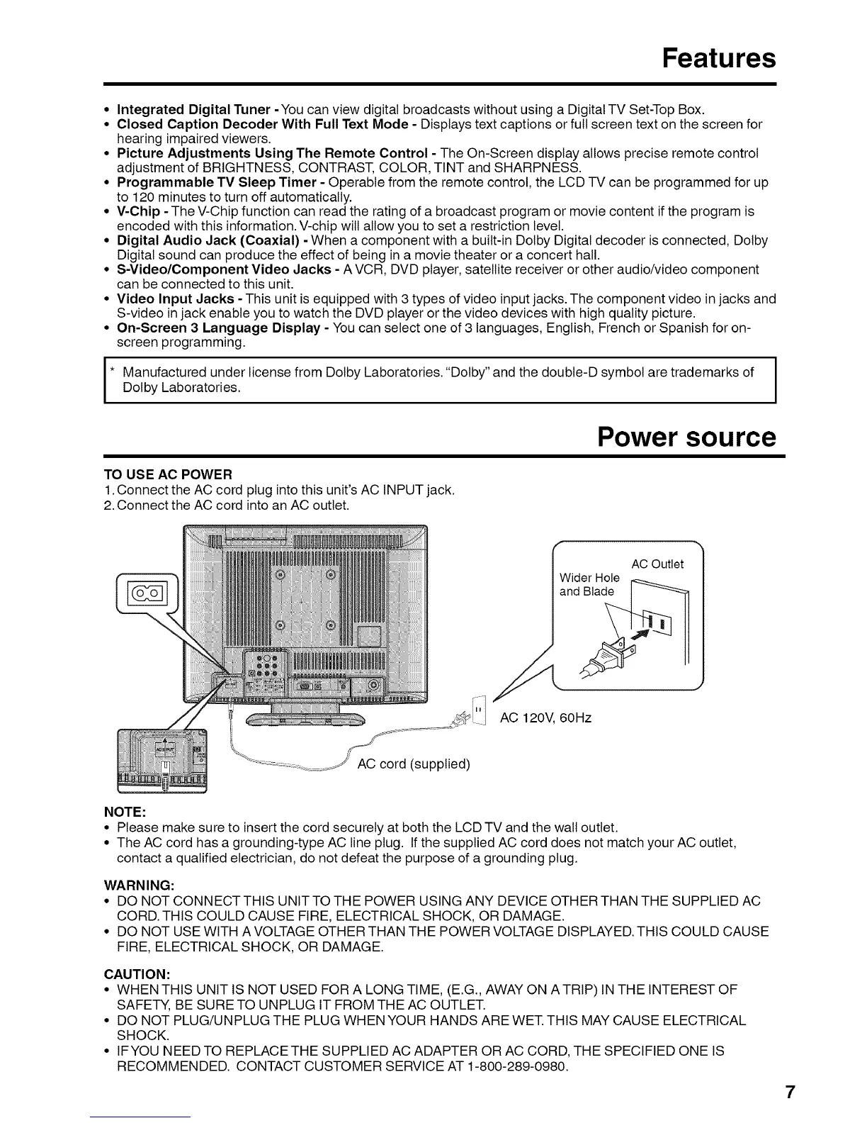 • Please make sure to insert the cord securely at both the LCD TV and the wall outlet.