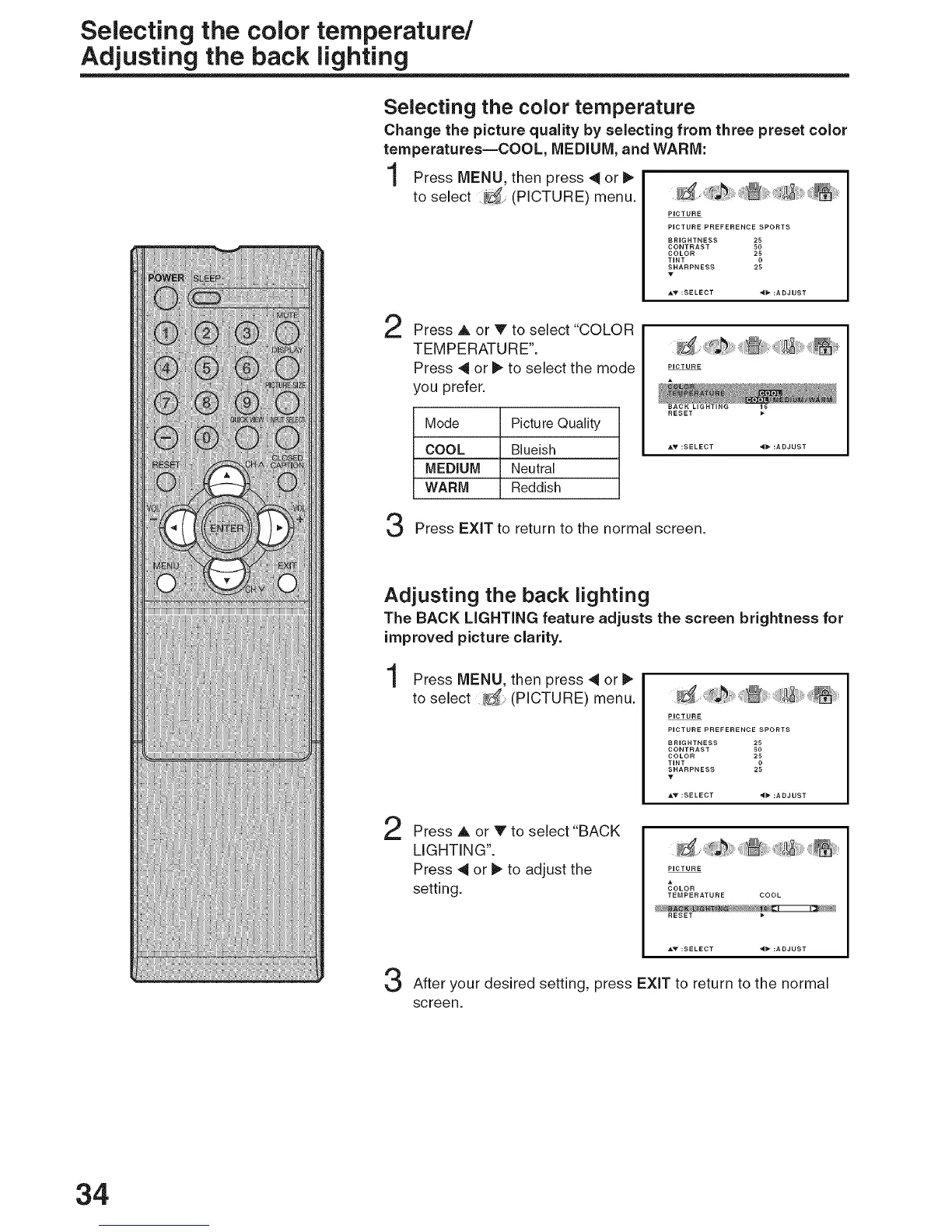 Change the picture quality by selecting from three preset color