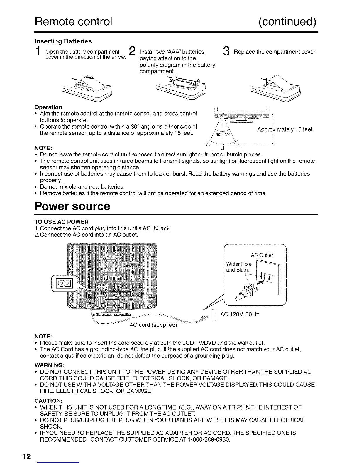 • Please make sure to insert the cord securely at both the LCD TV/DVD and the wall outlet.