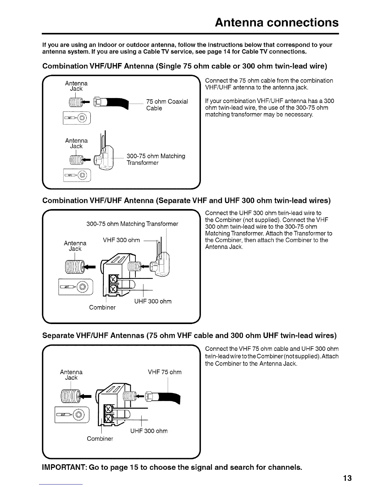 Separate VHF/UHF Antennas (75 ohm VHF cable and 300 ohm UHF twin-lead wires)