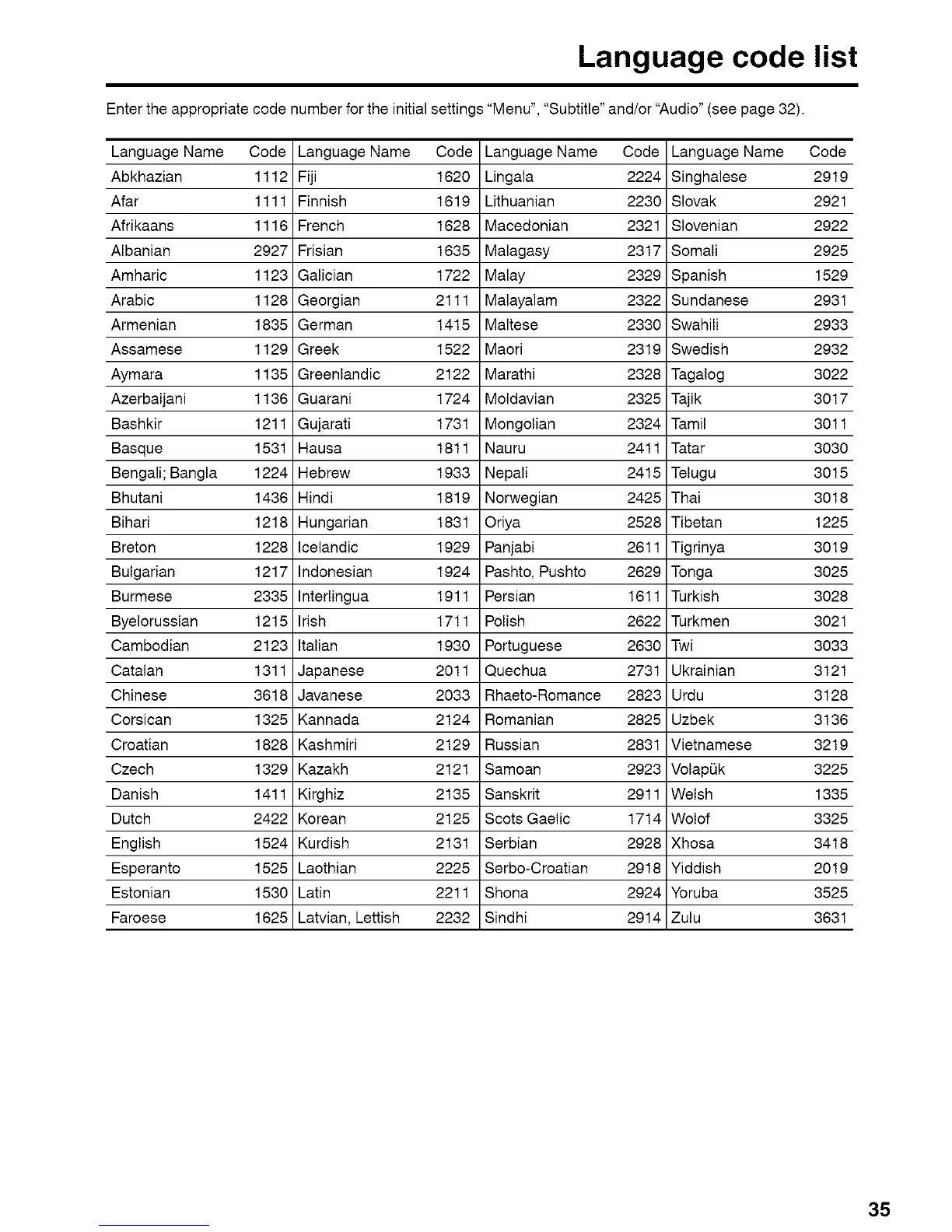 Enter the appropriate code number for the initial settings "Menu", "Subtitle" and/or "Audio" (see page 32).