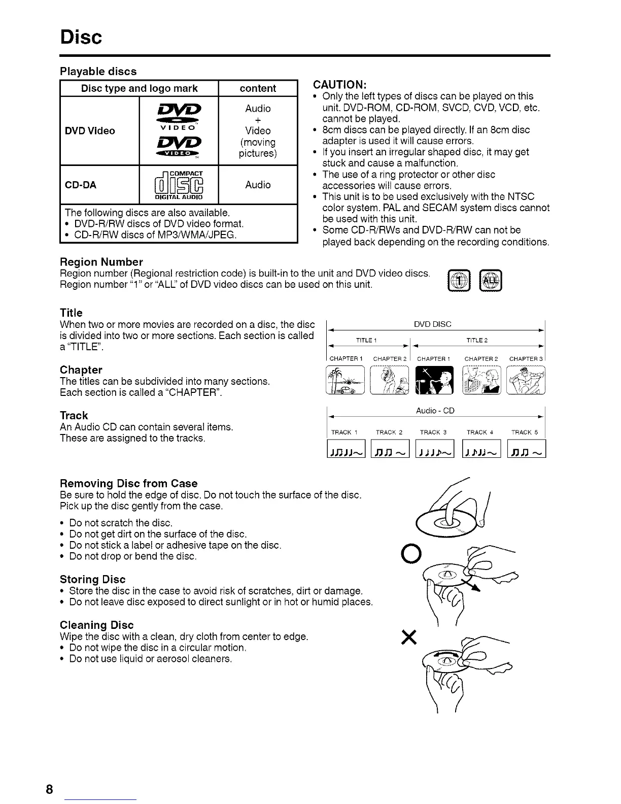 Region number "1" or "ALl/' of DVD video discs can be used on this unit.