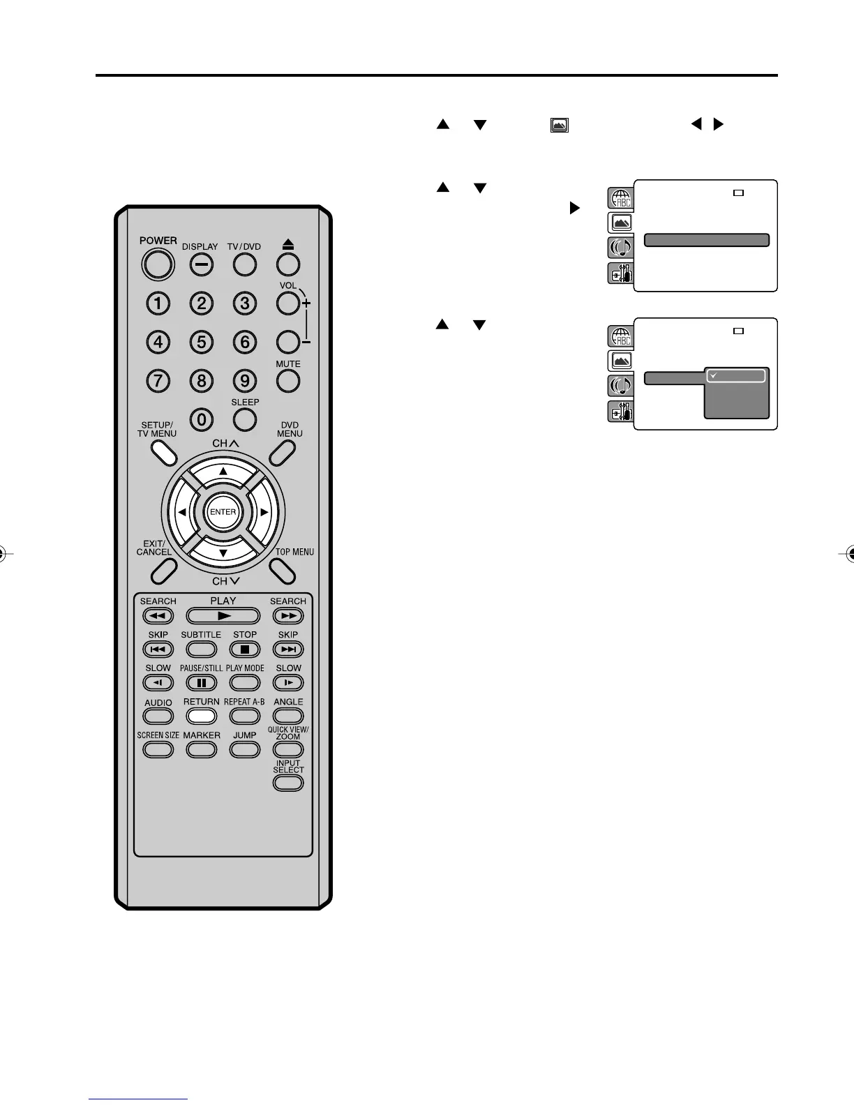 Press SETUP/TV MENU or RETURN to remove the Menu