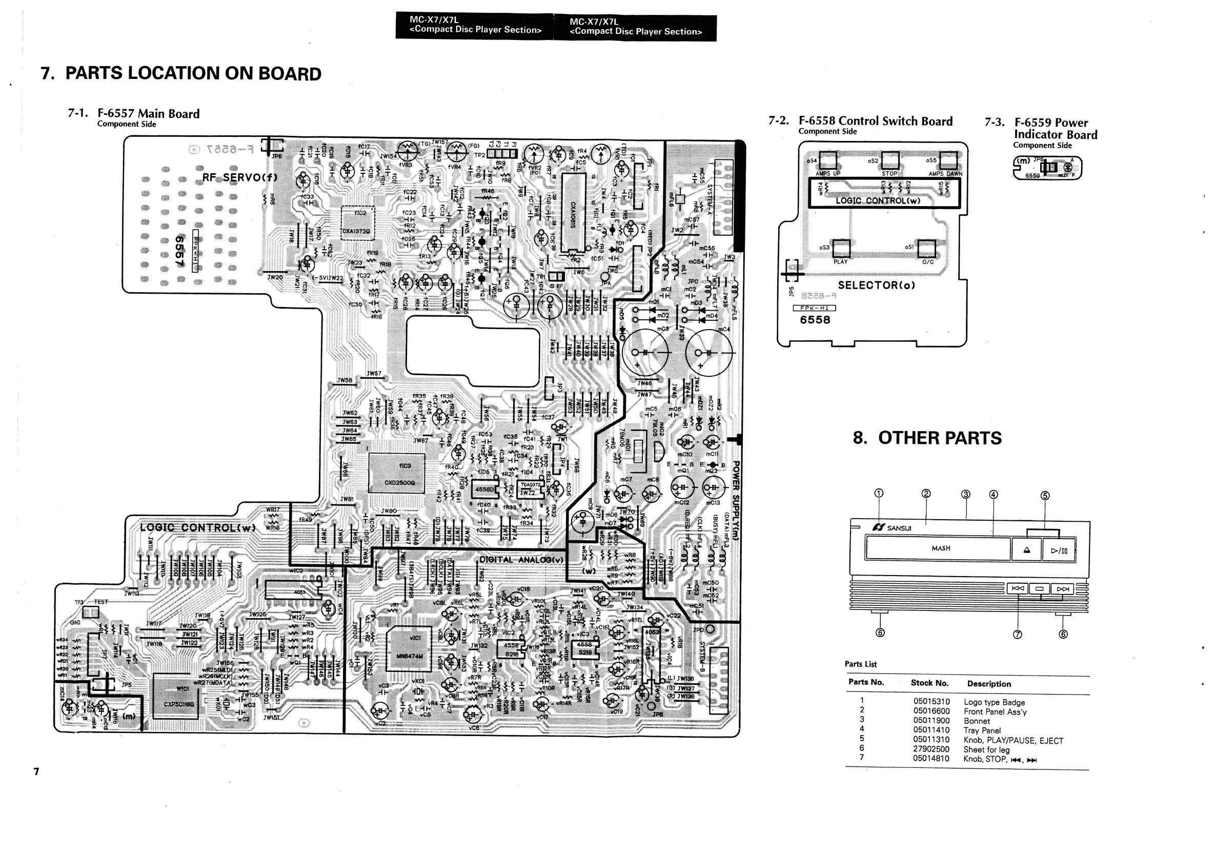 Sansui MC-X7 - Component Location on Boards; F-6557 Main Board Component Layout; F-6558 Control Switch Board Layout; F-6559 Power Indicator Board Layout