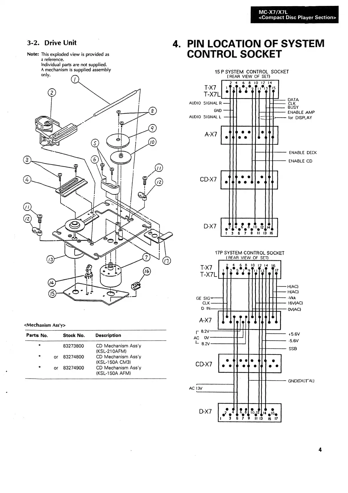Sansui MC-X7L - Drive Unit Exploded View; Pin Location of System Control Sockets