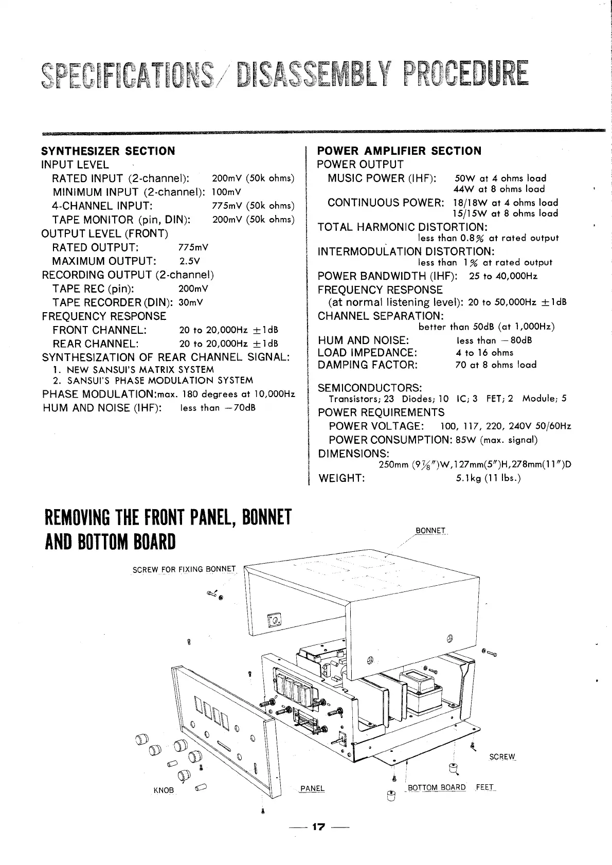 Sansui QS-100 - Specifications and Disassembly; Specifications; Removing the Front Panel, Bonnet and Bottom Board