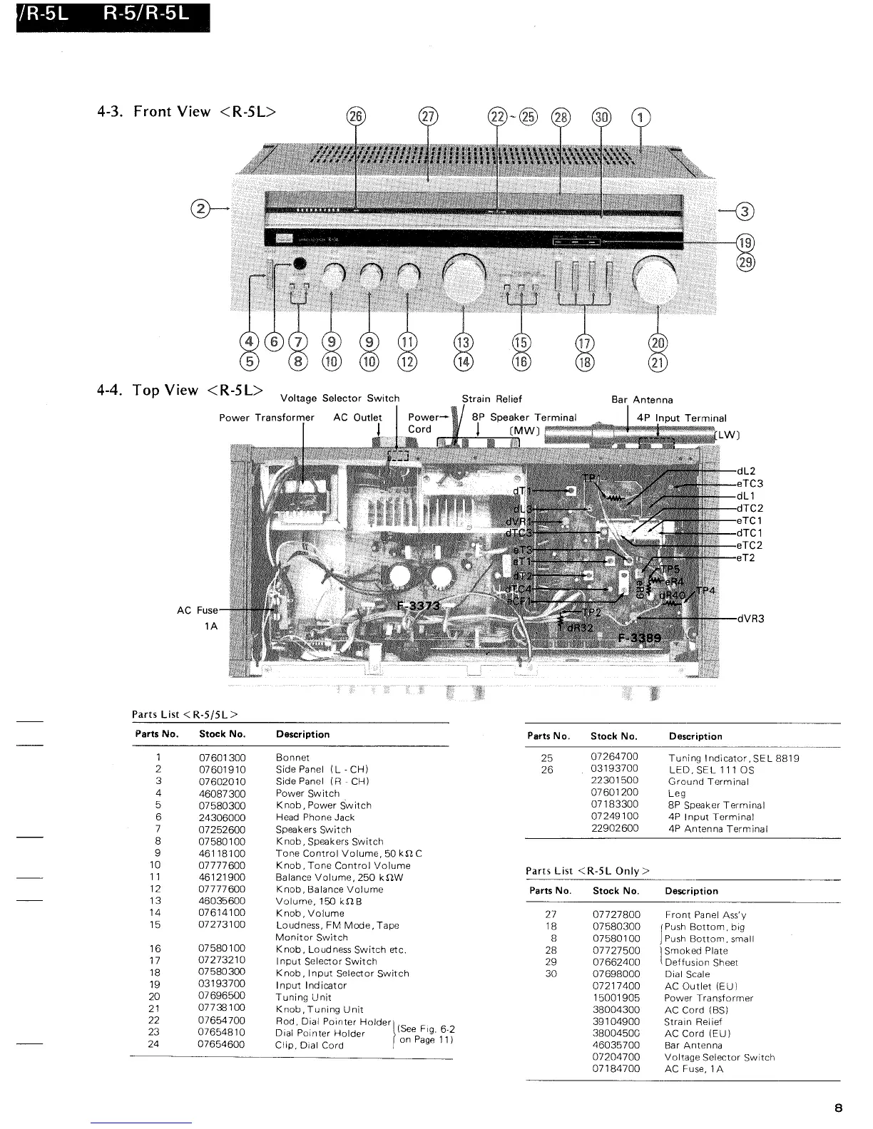 Sansui R-5 - Component Identification; Front View Controls and Indicators (R-5 L); Top View Internal Components (R-5 L)