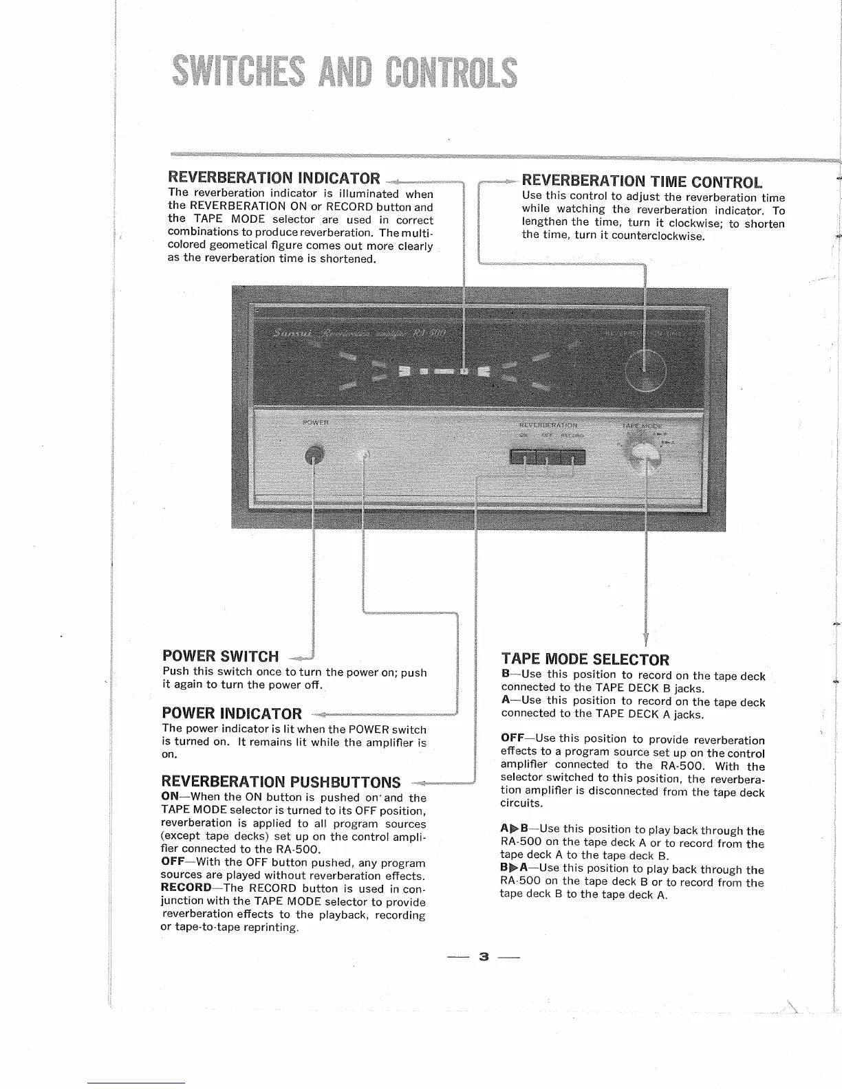 Sansui RA-500 - Switches and Controls; Reverberation Indicator; Reverberation Time Control; Power Switch