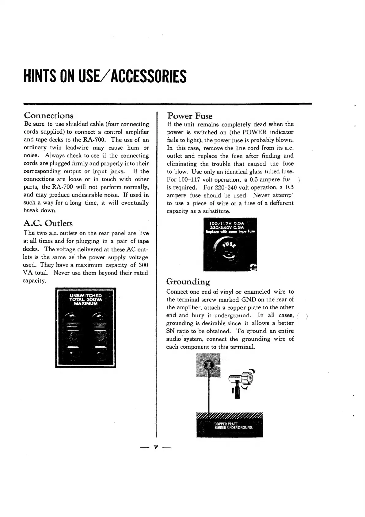 Sansui RA-700 - Hints on Use and Accessories; Usage Advice and AC Outlets; Power Fuse Replacement
