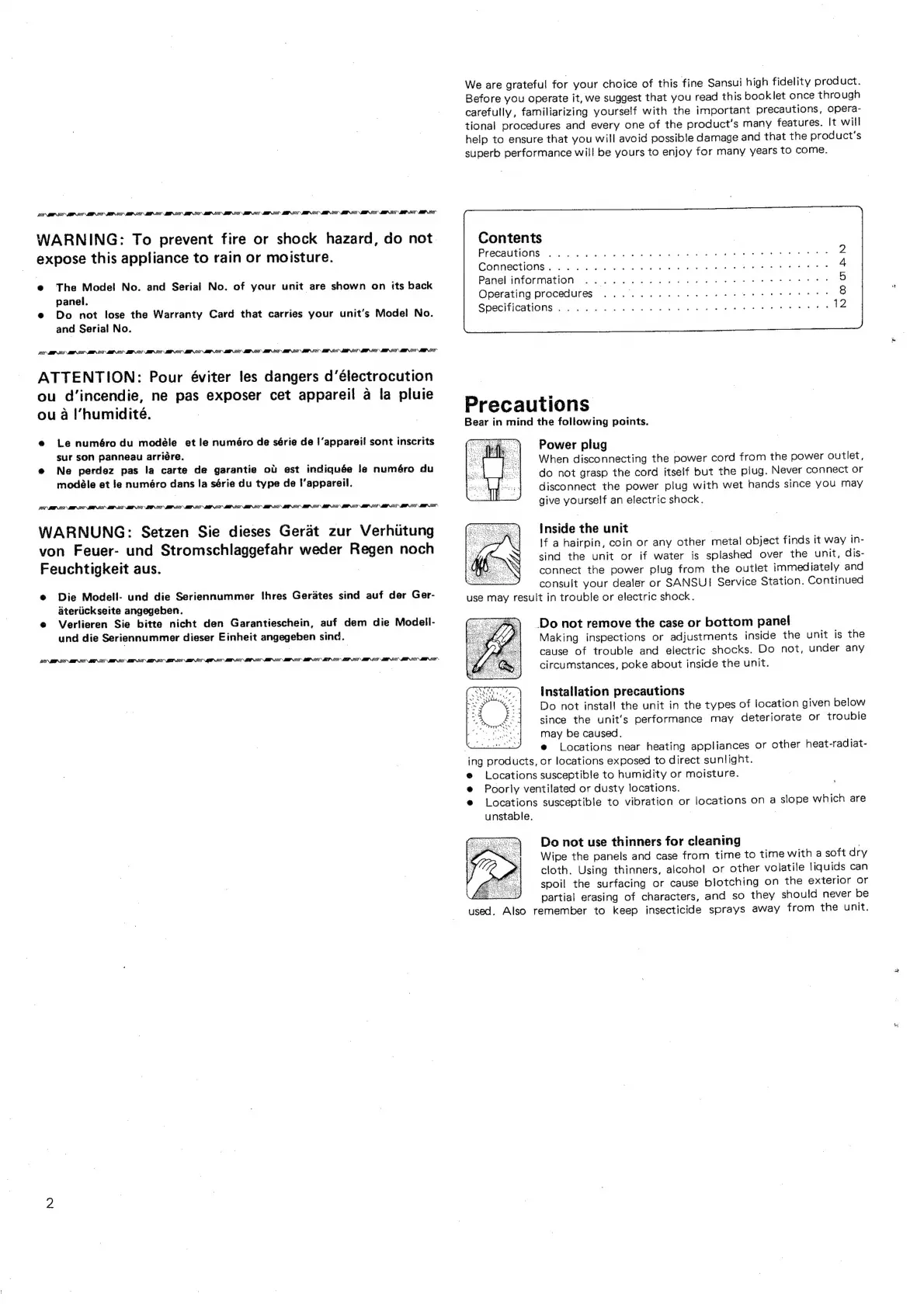 Sansui RA-990 - Safety Precautions; Power Plug Safety; Internal Unit Hazards; Chassis Access Prohibition