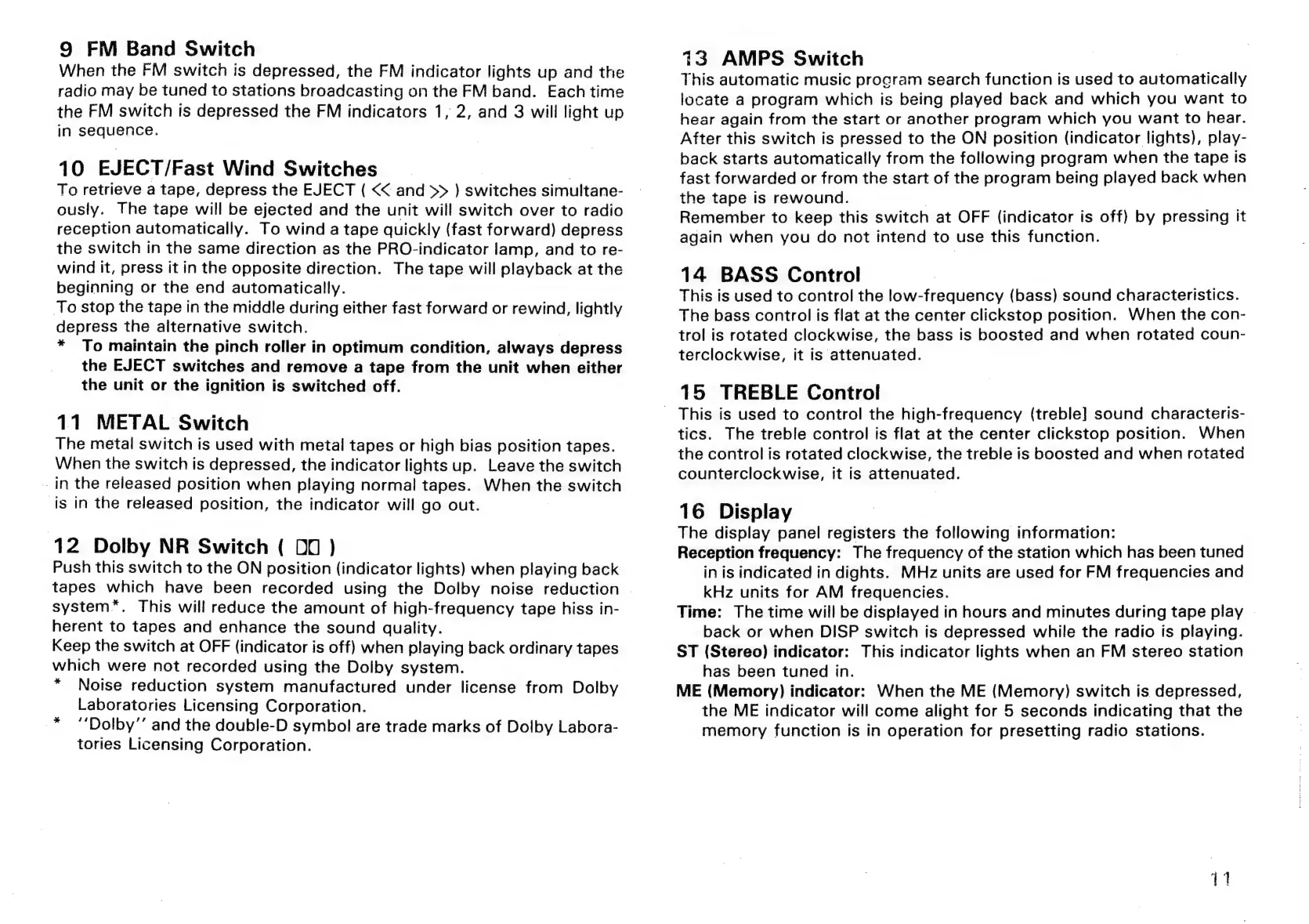 Sansui RX-710 - FM Band Switch; EJECT;Fast Wind Switches; METAL Switch; Dolby NR Switch