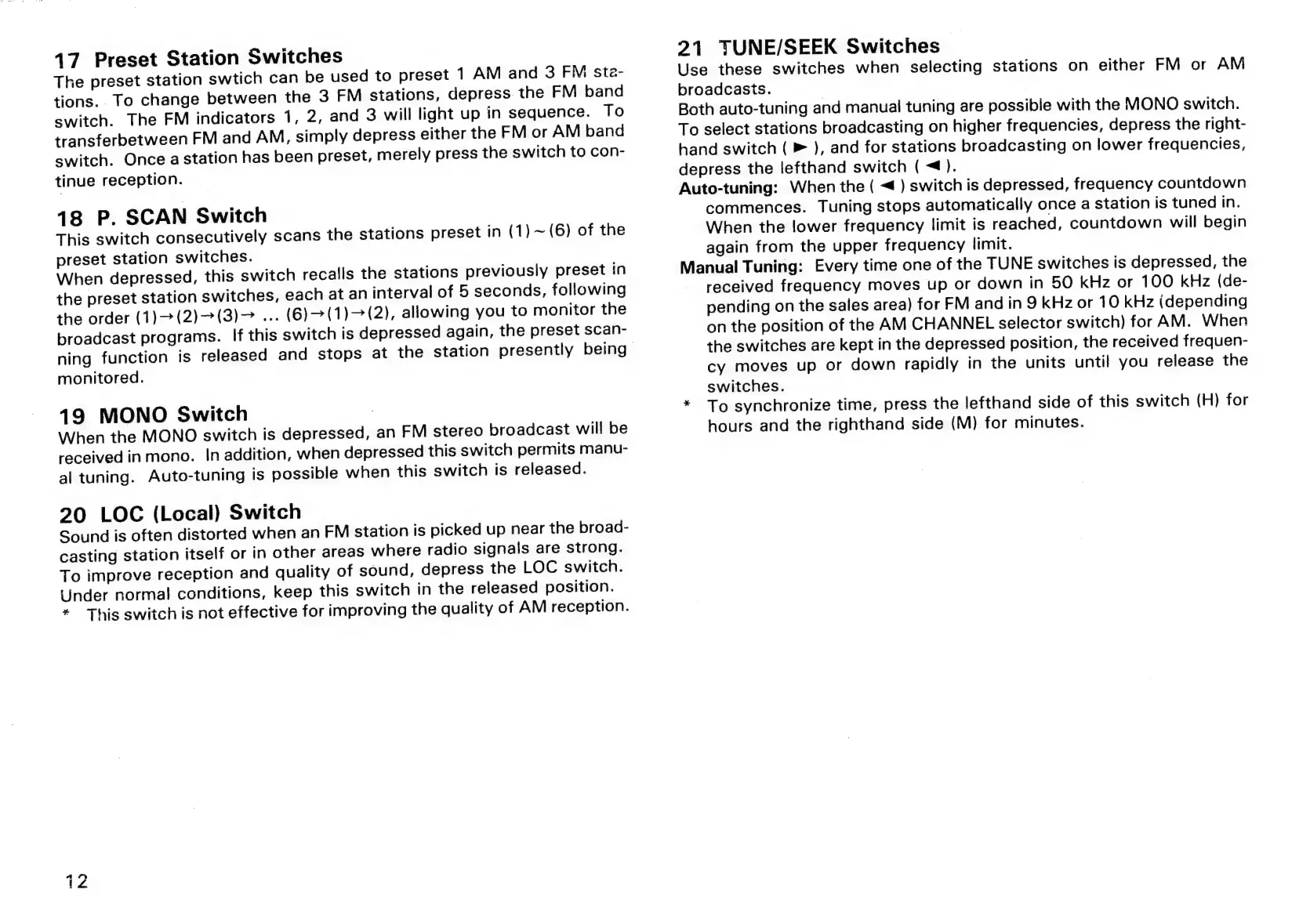 Sansui RX-710 - Preset Station Switches; P. SCAN Switch; MONO Switch; LOC (Local) Switch