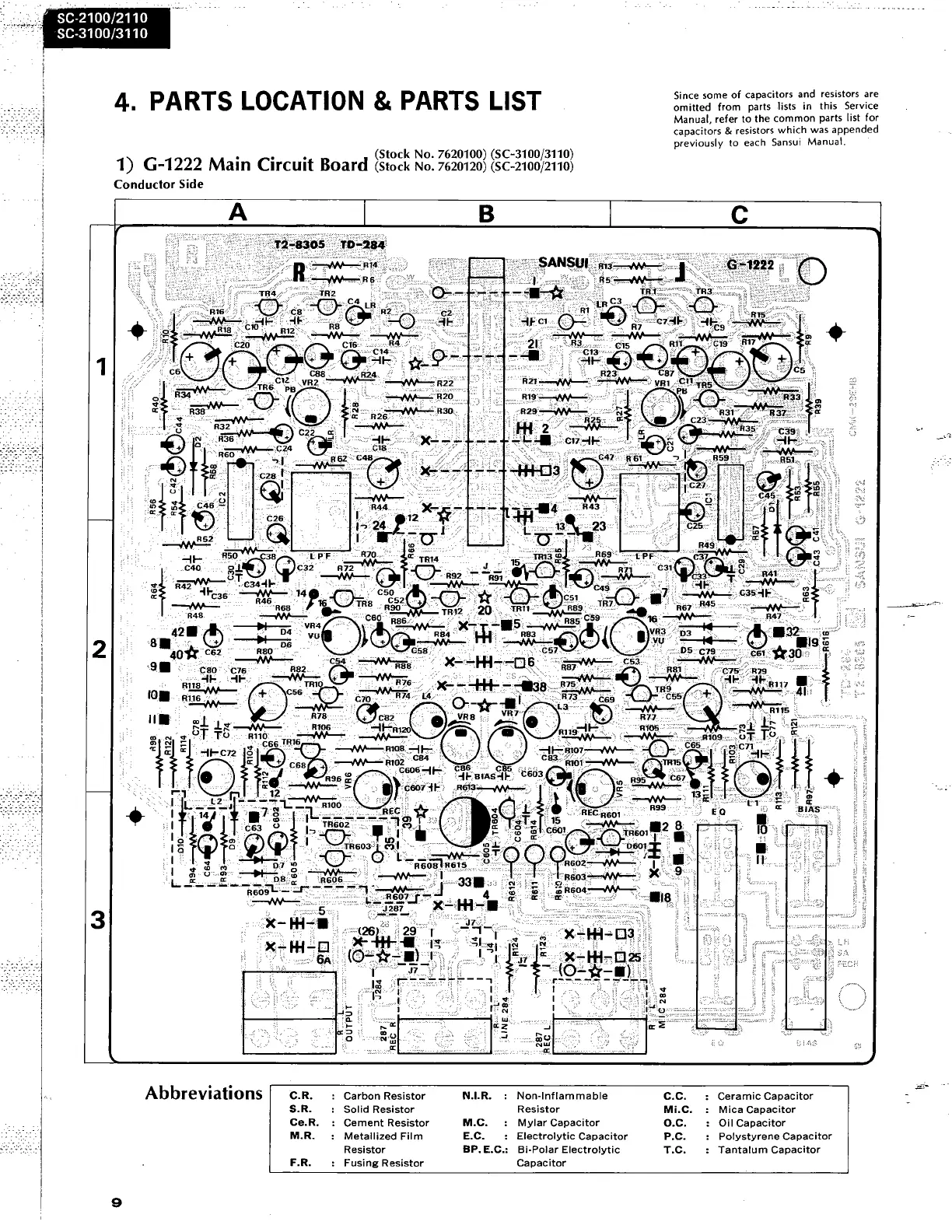 Sansui SC-3110 - PARTS LOCATION & PARTS LIST; G-1222 Main Circuit Board; G-1221 Muting Circuit Board; G-1229 LED (B) Circuit Board