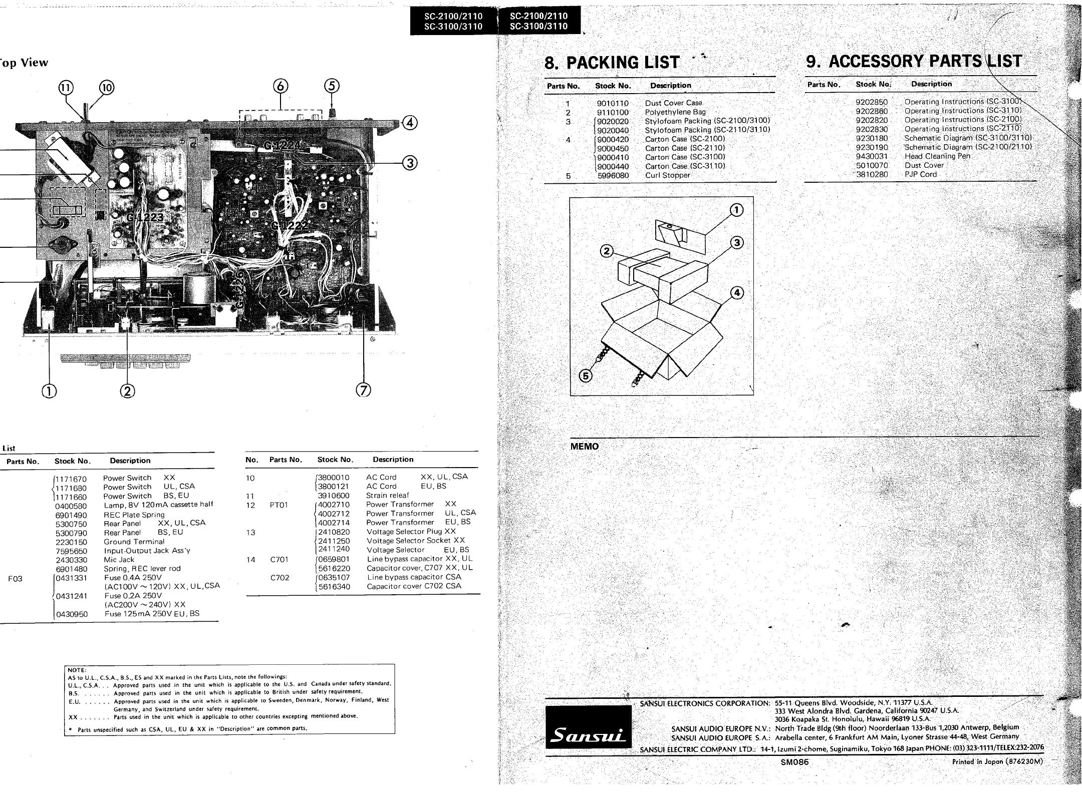 Sansui SC-3110 - PACKING LIST; ACCESSORY PARTS LIST