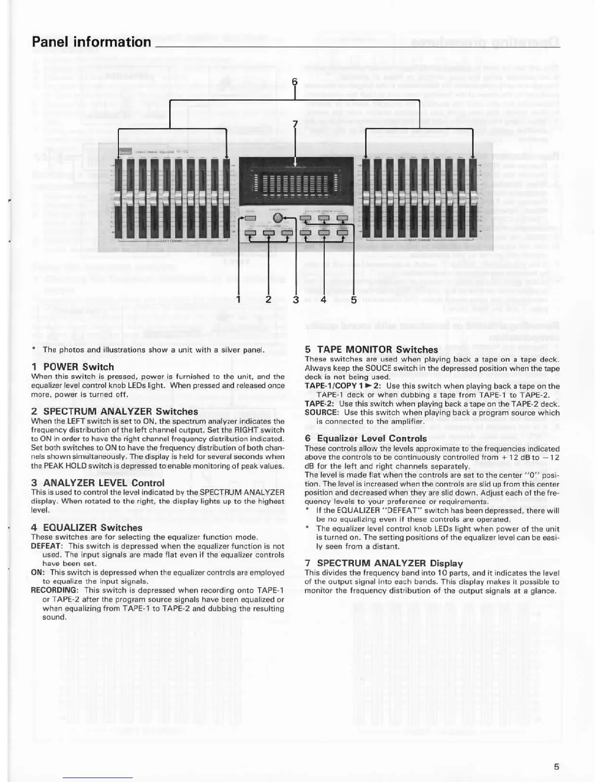 Sansui SE-8X - Front Panel Overview; Power and Analyzer Controls; Equalizer and Tape Monitor Controls; Spectrum Analyzer Display Function