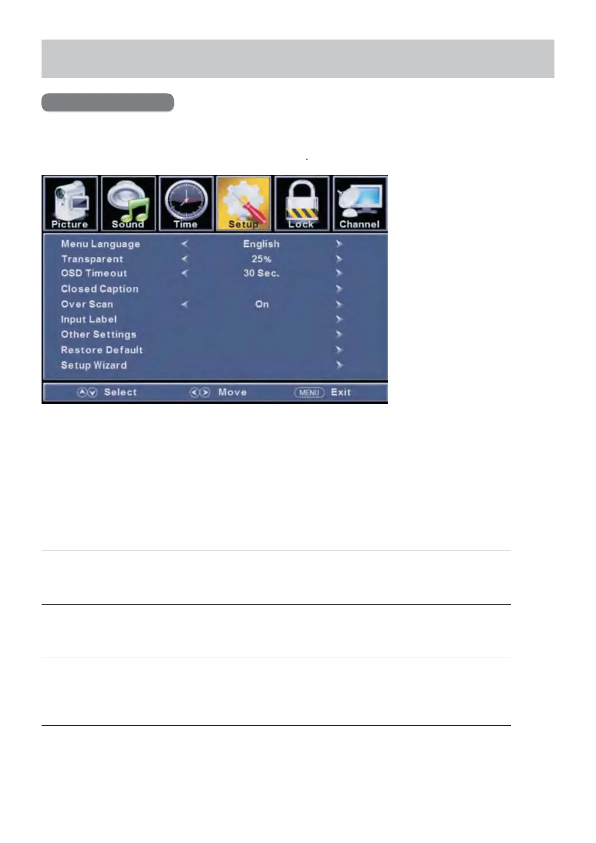 Appuyez sur le bouton W /X pour choisir entre Langue du Menu/Transparence/Interruption OSD/