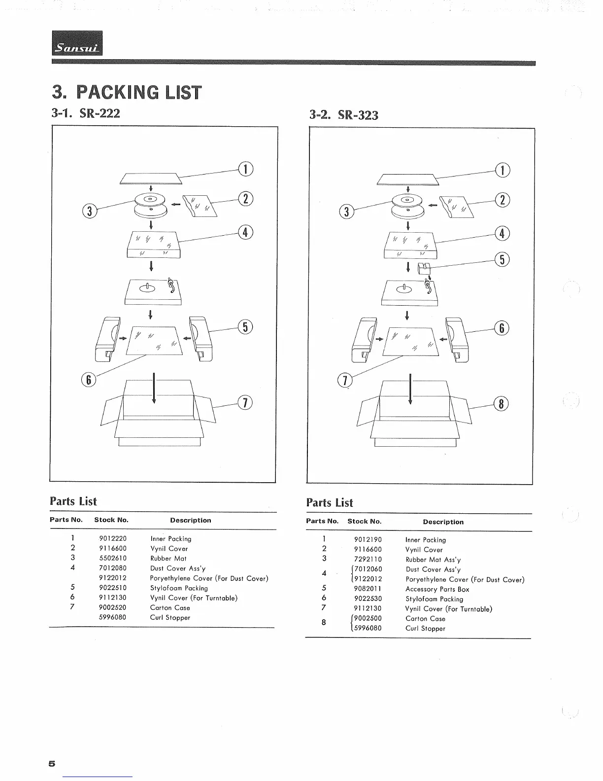 Sansui SR-222 - Sansui Turntable Packing Lists; SR-222 Packing List; SR-323 Packing List