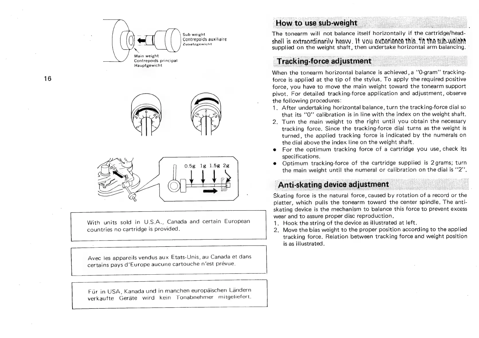 Sansui SR-636 - Weight and Force Adjustments; Sub-weight Usage; Tracking-Force Adjustment; Anti-Skating Device Adjustment