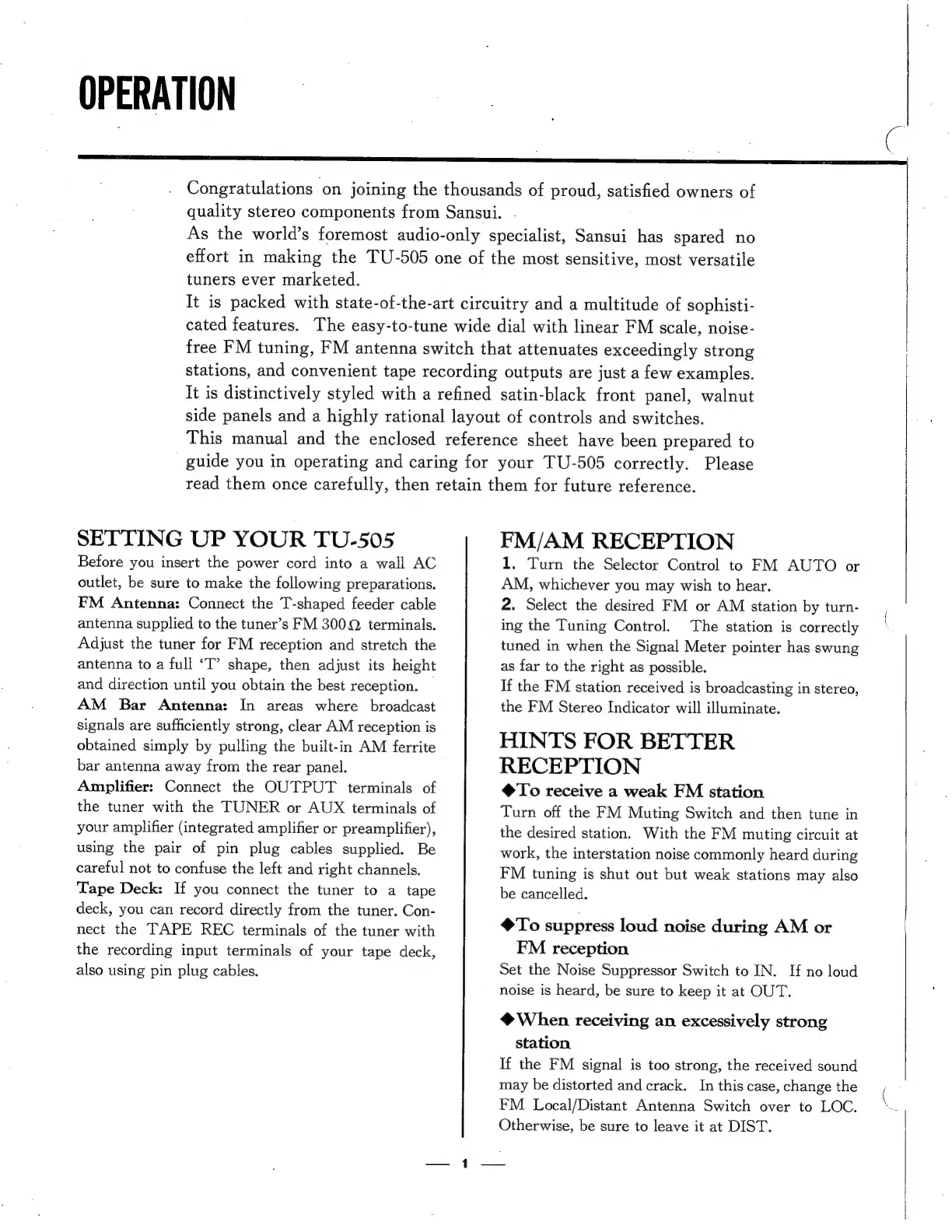 Sansui TU-505 - Operation; Setting Up Your TU-505; FM;AM Reception; Hints for Better Reception