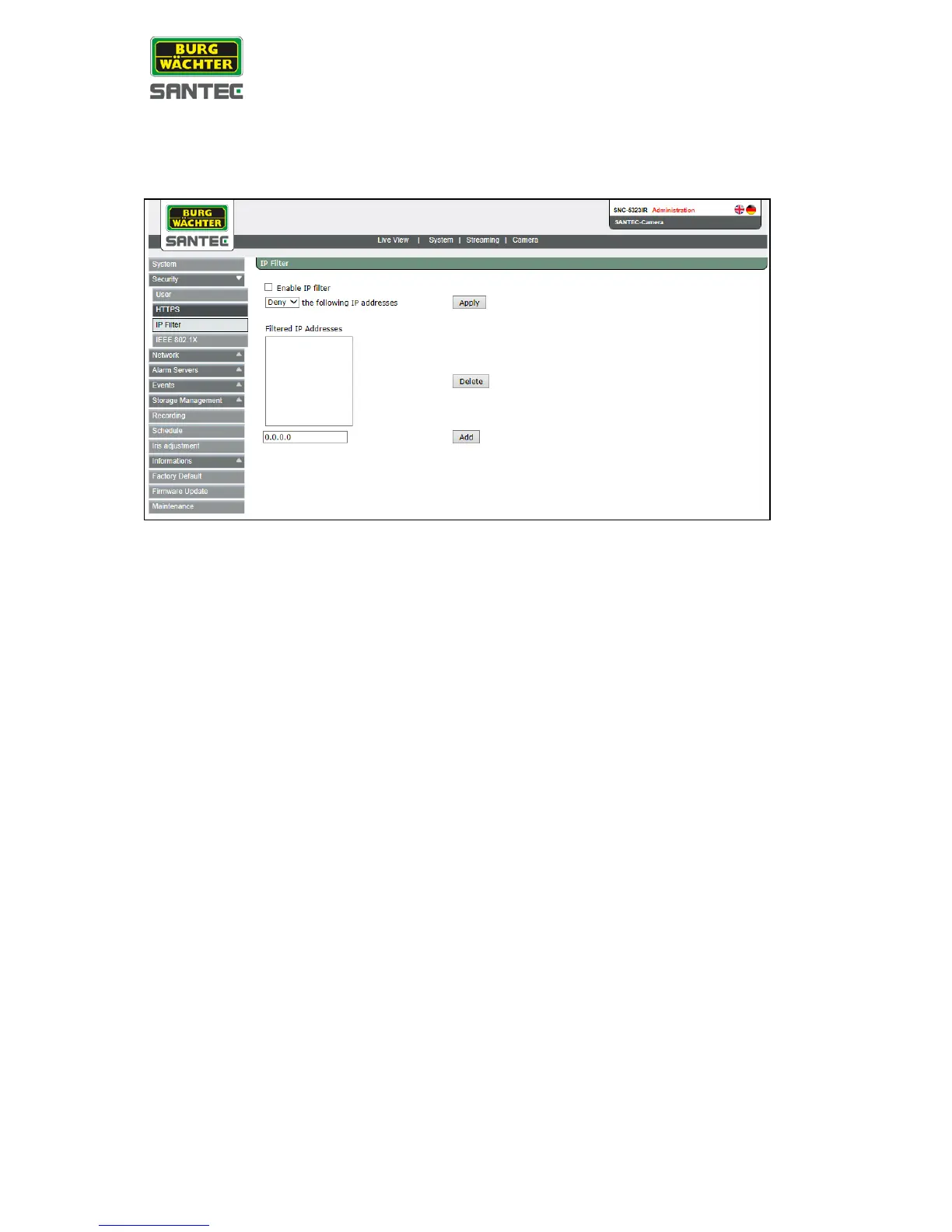 Using the IP Filter, access to the IP camera can be restricted by denying/allowing specific IP