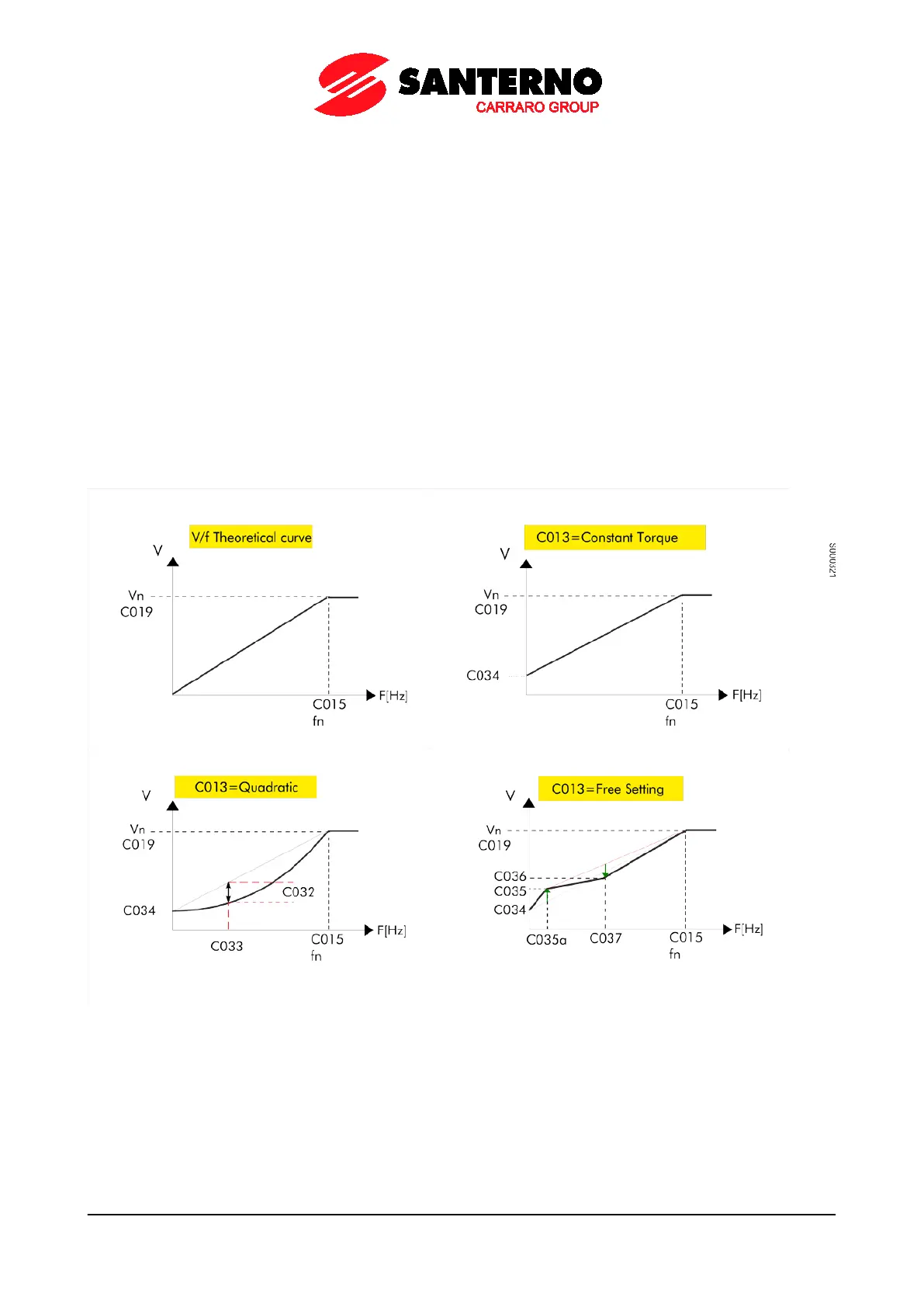 If C013 = Quadratic, the drive will follow a V/f pattern with a parabolic trend. You can set the starting voltage value