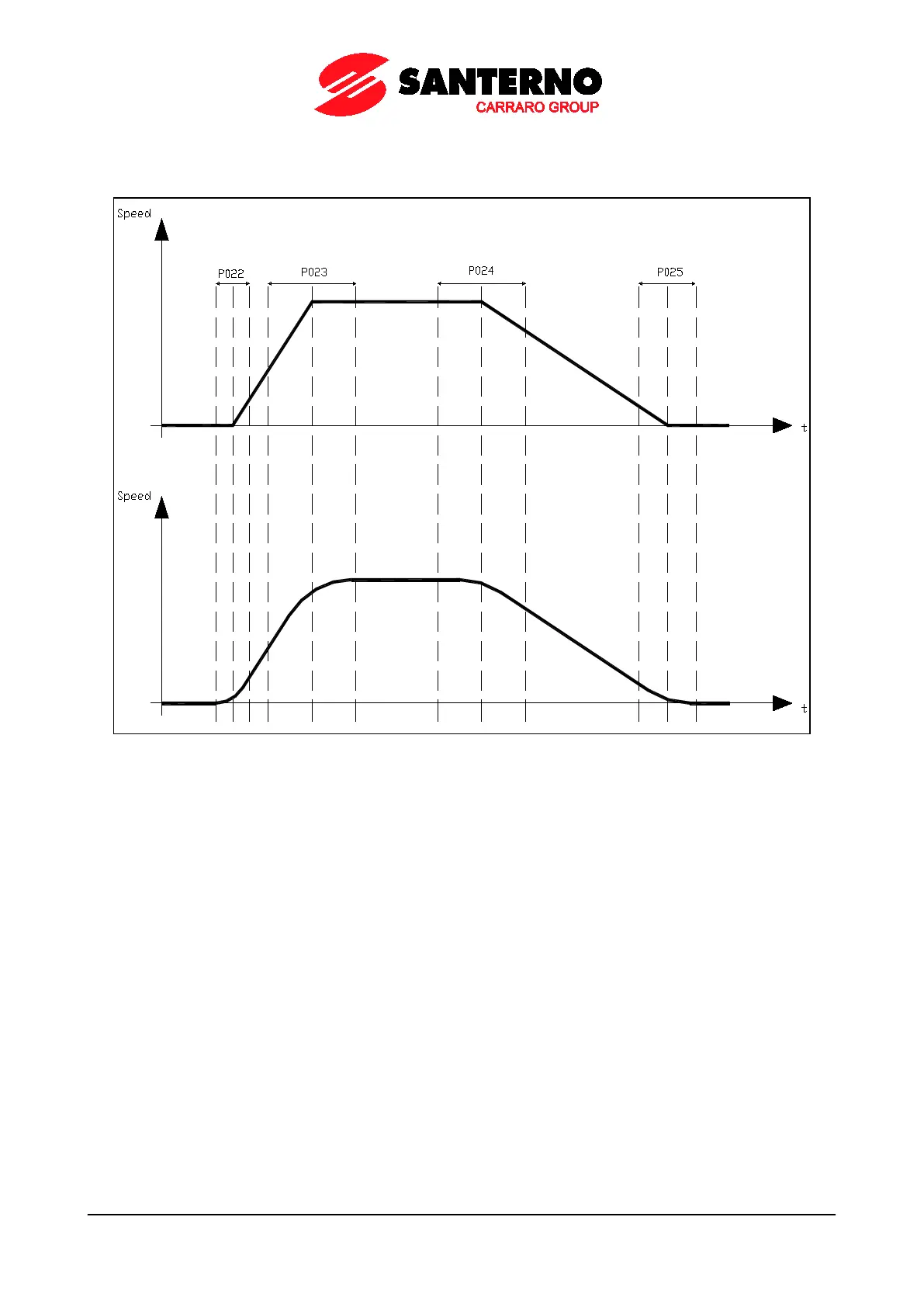 Example: P009 = 10sec ; P021 = 1111 binary (rounding off selected for all four ramps); P022 = 50%; P023 = 50%