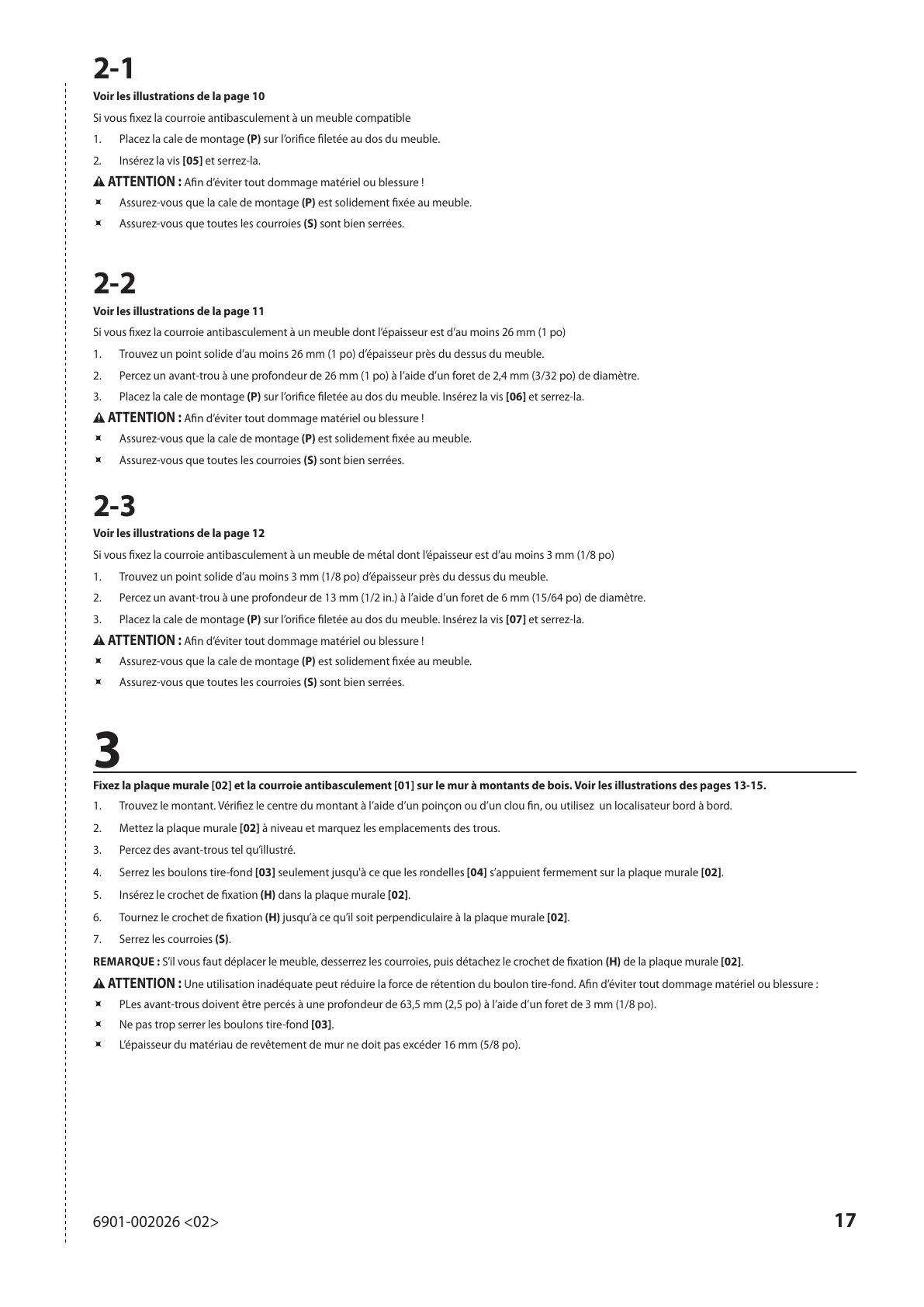 Fixez la plaque murale [02] et la courroie antibasculement [01] sur le mur à montants de bois. Voir les illustrations des pages 13-15.