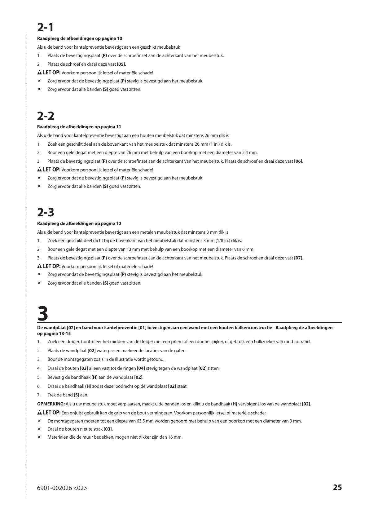 De wandplaat [02] en band voor kantelpreventie [01] bevestigen aan een wand met een houten balkenconstructie - Raadpleeg de afbeeldingen