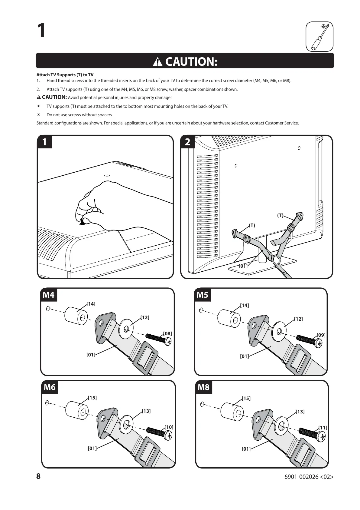 2. Attach TV supports (T) using one of the M4, M5, M6, or M8 screw, washer, spacer combinations shown.