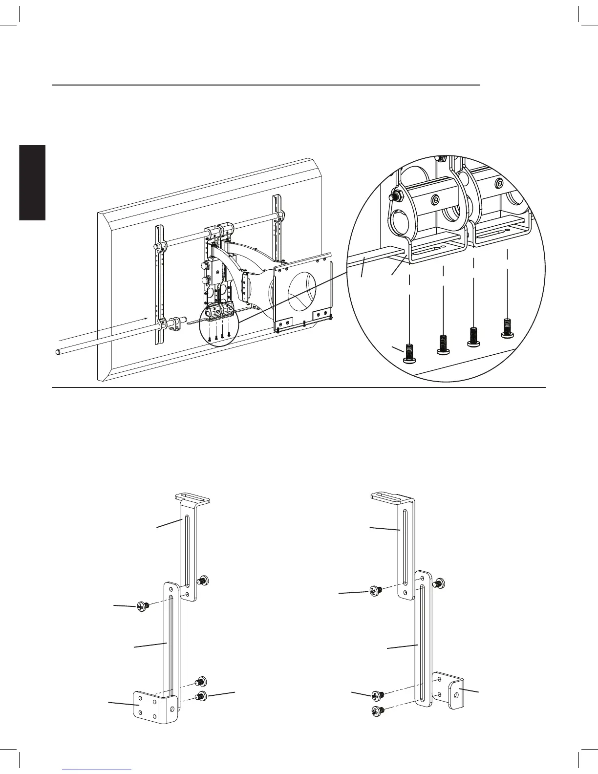 Deslice el tubo transversal inferior a través del primer soporte del monitor, el primer soporte de la barra (e), ambos conjuntos del eje, un