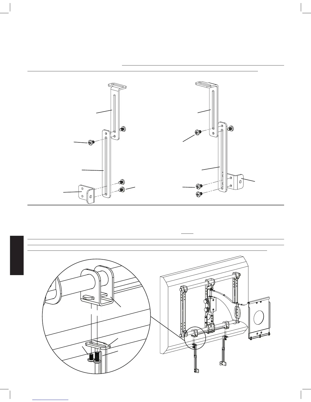 Завинтите винт 1/4 - 20 x 3/8 (j) через каждый верхний удлинитель (a,b) в крепежную скобу (e). Затяните, чтобы закрепить